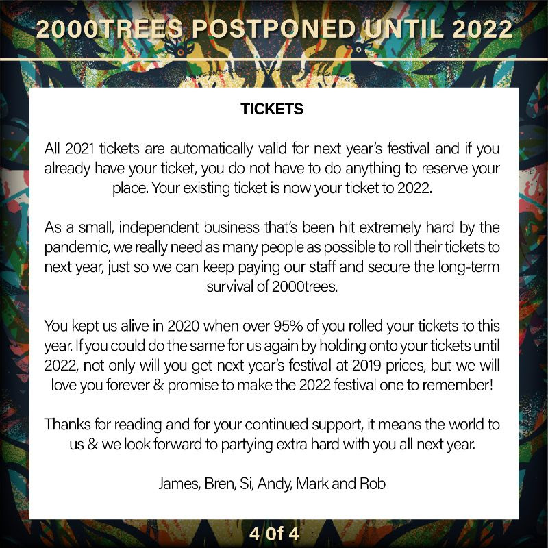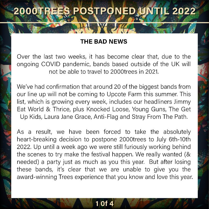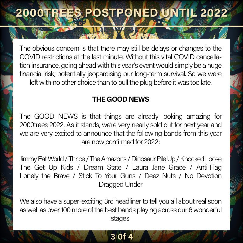 Sad news 2000trees – home to Punk and alt-Rock legends every summer is postponed for 2021. The fest gave a lengthy statement to fans as to why the fest cannot take place this year, mainly due to the protracted shutdown, and pandemic. On the plus side, the fest will return for 2022 and the new dates will be 7th, 8th and 9th July 2022. Bands confirmed to return in 2022 include Jimmy Eat World, Thrice, The Amazons, Dinosaur Pile Up, Knocked Loose, The Get Up Kids, Dream State, Laura Jane Grace, Anti-Flag, Lonely The Brave, Stick To Your Guns, Deez Nuts, No Devotion, Dragged Under with a third headliner to be announced and over 100 more bands across six stages.