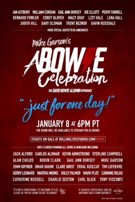 To mark not only the birthday of Rock icon David Bowie, but five years since his untimely death from cancer, a legion of rock stars influences but the music giant will gather on January 8, 2021, for a concert. Mike Garson and producers Stacey Sher and Kerry Brown have joined forces with Rolling Live Studios to produce “A Bowie Celebration: Just For One Day!”, bringing together dozens of Bowie alumni band members spanning Bowie’s career from his 1969 self-titled album to his final album, “Blackstar”, along with many of the world’s most famous voices for a very special experience. The concert will feature performances from Trent Reznor (Nine Inch Nails), Billy Corgan (The Smashing Pumpkins), Bowie’s good friend and Oscar-winning actor Gary Oldman, Gavin Rossdale (Bush), Perry Farrell (Jane’s Addiction), Joe Elliott (Def Leppard), Grammy-winning Singer Macy Gray, Ian Astbury (The Cult), Lzzy Hale (Halestorm), Gail Ann Dorsey (David Bowie, Lenny Kravitz), Bernard Fowler (The Rolling Stones), Corey Glover (Living Color), Tony-winning rocker Lena Hall, vocal phenom Judith Hill (Grammy winner for “20 Feet From Stardom”), and many more to be announced. Watch a trailer for the event here: