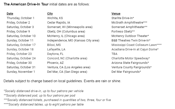 The nationwide trek will follow current local health guidelines for fans’ safety and enjoyment. Some shows will be drive-in events with patrons in or adjacent to their cars, and other shows will feature viewing from socially distanced fan “pods” or tables designed for up to four people.