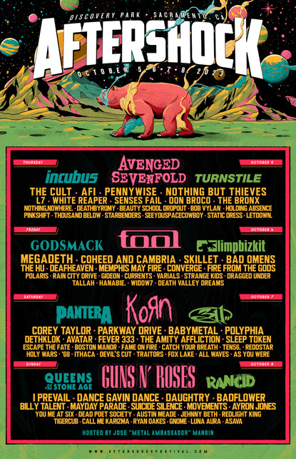 The West Coast’s Biggest Rock Festival, Aftershock, grows even more in 2023 with its most packed lineup yet offering 95-plus bands over four full days, led by headliners Guns N’ Roses, Tool, Avenged Sevenfold, and Korn. The destination event, held at Discovery Park in Sacramento, CA on October 5-8, builds on last year’s record-setting success including an audience of 160,000 music fans and bringing in nearly $30 million to the region. The festival is headlined by Guns N’ Roses, Tool, Avenged Sevenfold, Korn, Godsmack, Pantera, Incubus, Queens Of The Stone Age, Limp Bizkit, with Megadeth, Rancid, Turnstile, 311, The Cult, and many more! Watch the announcement video here and get your tickets and full details at the link below.