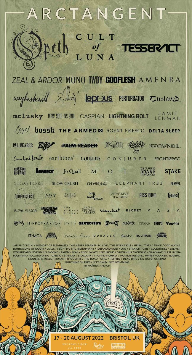 Opeth , Cult of Luna , TesseracT , Zeal & Ardor , MONO , TWDY , Godflesh , Amenra , Maybeshewill , Alcest , Leprous , Perturbator , Enslaved , Mclusky , Devil Sold His Soul , Caspian , Intervals [delete] , Lightning Bolt , Jamie Lenman , Covet , Bossk , The Armed , Agent Fresco , Delta Sleep , Pallbearer , The Locust [delete] , Puppy , Palm Reader , Car Bomb [delete] , Intronaut , Oranssi Pazuzu , Rivers of Nihil , Emma Ruth Rundle , Earthtone9 , A.A.Williams , Conjurer , IMPERIAL TRIUMPHANT , Frontierer , Arabrot , Jo Quail , MØL , The St. Pierre Snake Invasion , Stake , Sugar Horse , Slow Crush , Clever Girl , Elephant Tree , Talons , Thank You Scientist , Wheel , Pijn , DVNE , Her Name Is Calla , Alpha Male Tea Party , Boss Keloid , Heriot , Pupil Slicer , Mass of the Fermenting Dregs , The Hirsch Effekt , My Own Private Alaska , Blanket , Blodet , VASA , Zetra , Hippotraktor , BRUIT ≤ , Castrovalva , Tuskar , Catbamboo , SEIMS , Traps , Vogons , Ithaca , Skin Failure , Natalie Evans , Odradek , Fall of Messiah [delete] , MIËT , Bolt Ruin , Jakub Zytecki , Astrosaur , Memory of Elephants , We Never Learned To Live , The Hyena Kill , Heisa , TOTS , Binge , Bonnacons of Doom , God Alone. , Lakes , FES , Five The Hierophant , Paranoid Void , Luo , Straight Girl , Coldbones , Skemer , worriedaboutsatan , El Moono , Axiom , Bear , Beige Palace , Bicurious , Garganjua , Kokomo , Graywave , Last Hyena , Pollyanna Holland-Wing , qariaq , STANLÆY , Stoßzahn , Thumpermonkey , Mother Vulture , Wavey , Olanza , Modern Rituals , Rubbing , Mutant-Thoughts , The Road , Still , Respire , Dead Bird , Ni Maîtres , Peach , My Octopus Mind , Lightning Sharks , Let’s Swim, Get Swimming