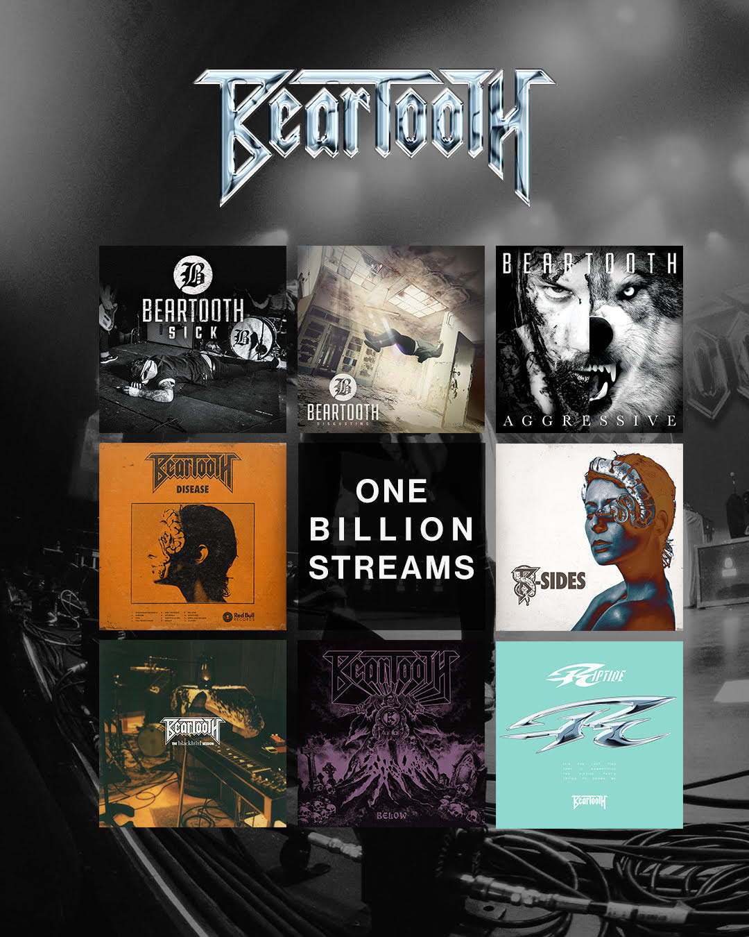 Wild times for Metalcore leaders Beartooth, as the Gold-selling rock band has earned 1.3 billion global streams across platforms and their catalog. The band, signed to Red Bull Records, recently released their new single and video “Riptide” which you can check out below. Catch the band in a few weeks at Aftershock Sacramento! See below for the breakdown of the band’s streaming success!