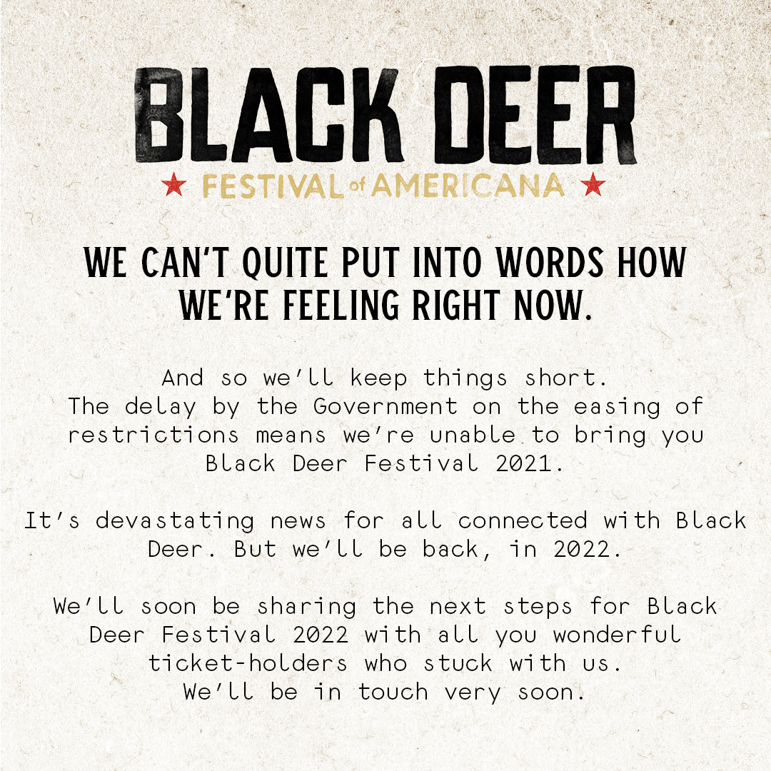 Devastating news as the Black Deer Festival, which had rebounded from the COVID -19 cancelation to sell 15,000+ tickets for the fest scheduled to take palace next weekend. Now the organizers behind the UK’s ‘Best New Festival’ have released a statement expressing their “devastation” to their ticket holders after the government extended lockdown restrictions for four weeks yesterday. Explaining that they “can’t quite put into words how we are feeling right now”. The 25-27th of June was unable to meet the government’s capacity requirements which remained capped at 4000.