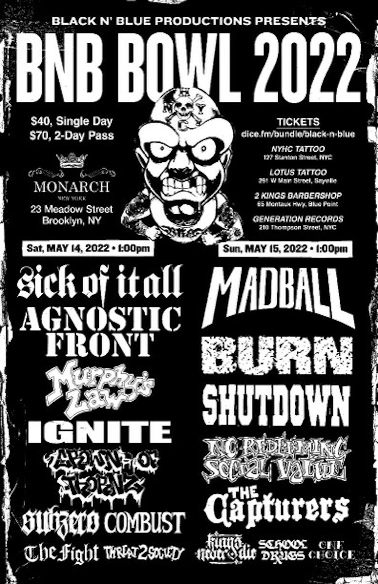 This year’s Black N Blue Bowl features performances from Agnostic Front, Sick Of It All, Madball, Murphy’s Law, Burn, No Redeeming Social Value, Crown of Thornz, Shutdown, Ignite, Subzero, The Ice Cold Killers, Combust, The Capturers, Kings Never Die, The Fight, Threat 2 Society and One Choice.