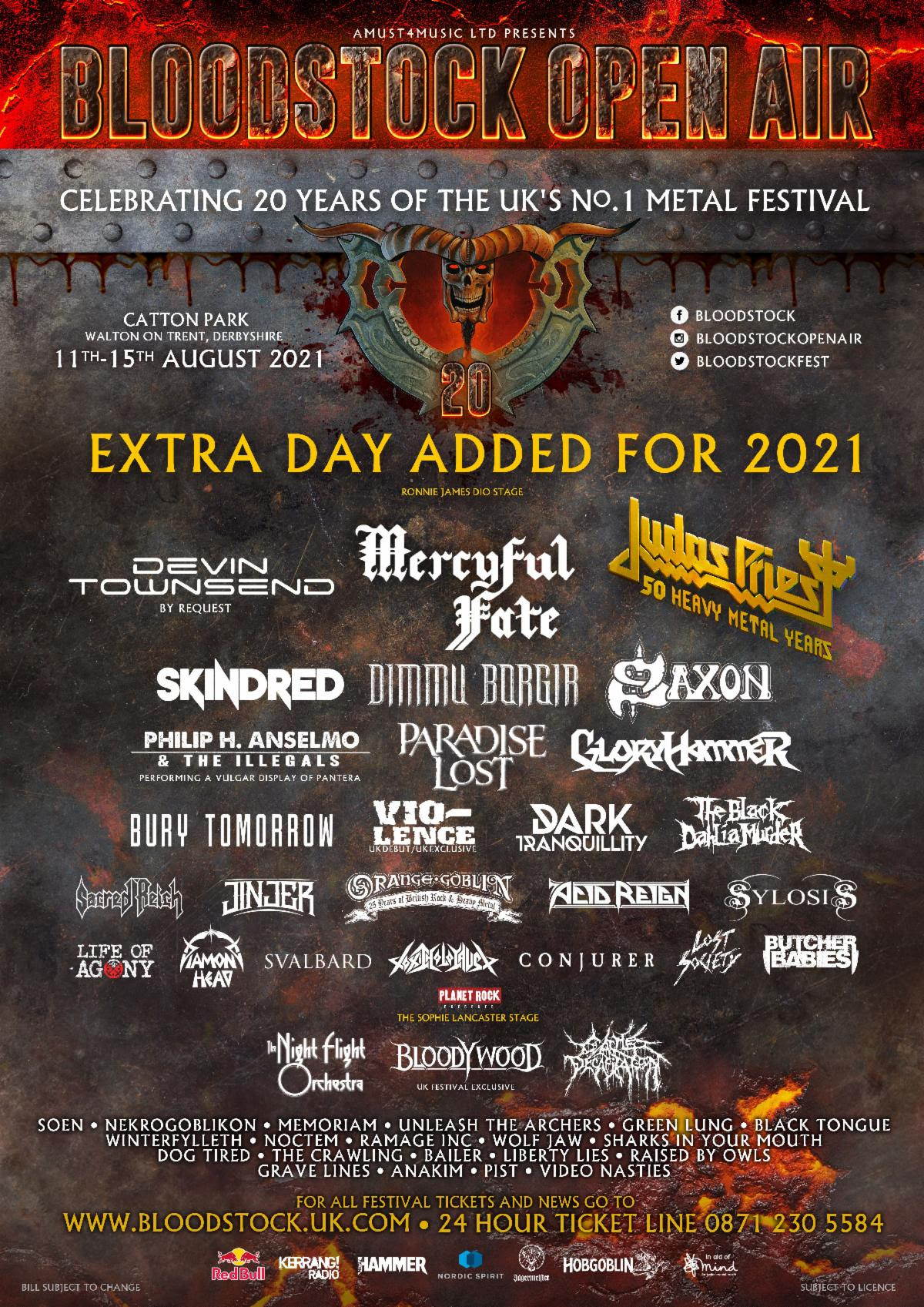 BLOODSTOCK’s 2021 other main stage headliners include Devin Townsend (Friday) and Judas Priest (Sunday). Headliners for Thursday are yet to be announced. The festival also features sets from Philip H. Anselmo & The Illegals, Skindred, Paradise Lost, Life Of Agony, Bury Tomorrow, Black Dahlia Murder, Diamond Head, Jinjer, Vio-lence, Sacred Reich, Gloryhammer, Dark Tranquillity, Butcher Babies, Cattle Decapitation, Bloodywood, Memoriam, Ramage Inc, Green Lung, Conjurer, Orange Goblin, The Night Flight Orchestra, Unleash The Archers, Saxon, Sylosis, Toxic Holocaust, Winterfylleth, Nekrogoblikon, The Crawling, Raised By Owls, Anakim, Acid Reign, Svalbard, Soen, Dog Tired, Bailer, Blasphemer, Black Tongue, Liberty Lies, Pist, & Sharks In Your Mouth