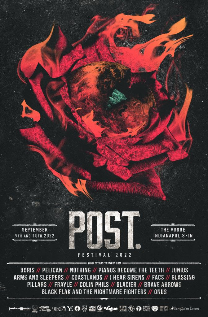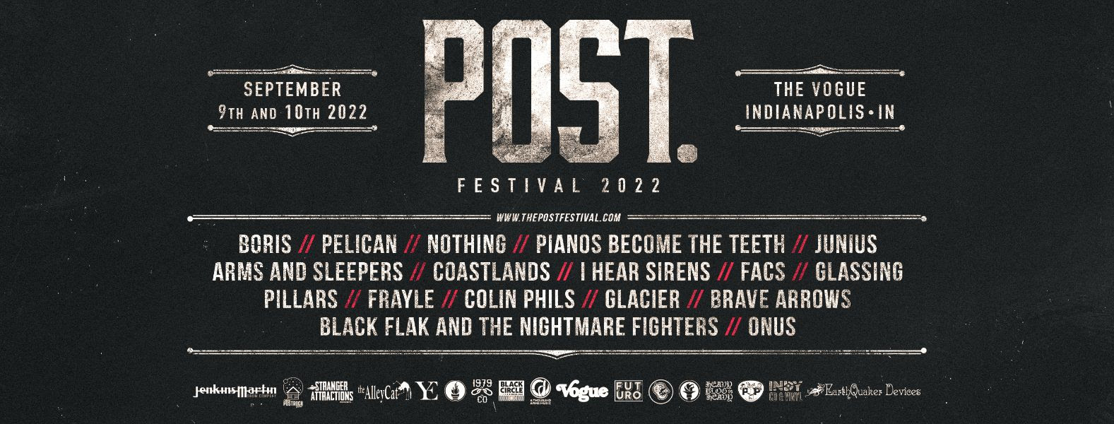 Indianapolis post-rock festival Post. Festival has announced its 2022 dates and lineup. As always, Post. Festival seeks to bring together both musicians and fans of post-adjacent genres “without the aid of commercial status.” This year’s line-up includes: Boris, Pelican, Nothing, Pianos Become the Teeth, Junius, Arms and Sleepers, Coastlands, I Hear Sirens, Facs, Glassing, Pillars, Fayle, Colin Phils, Glacier, Brave Arrows, Black Flak and The Nightmare Fighters, & Onus.