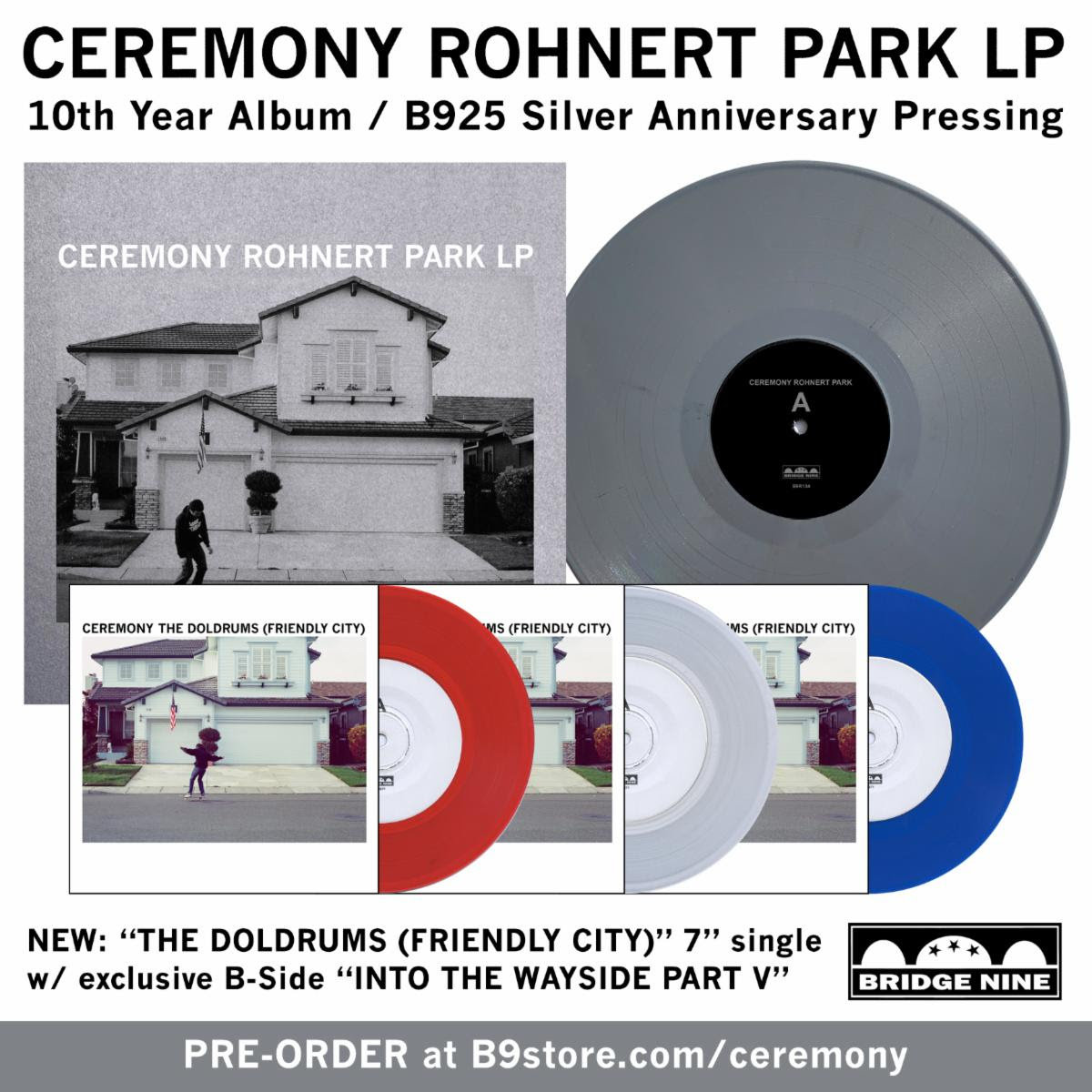 To celebrate the 10th anniversary of their excellent Rohnert Park release in June of 2010, California hardcore band Ceremony will drop a limited 7″ single of ‘The Doldrums (Friendly City)’ with a previously unreleased b-side, “Into The Wayside Part V”, unearthed from the original Rohnert Park recording session and mastered by Will Killingsworth. The release comes from venerable label Bridge Nine Records! A one-time edition of 1,500 copies. This will be paired with a silver vinyl anniversary pressing of the Rohnert Park LP housed in a special silverboard jacket and expanded liner notes. Listen to the two tracks now and pre-order the release below.