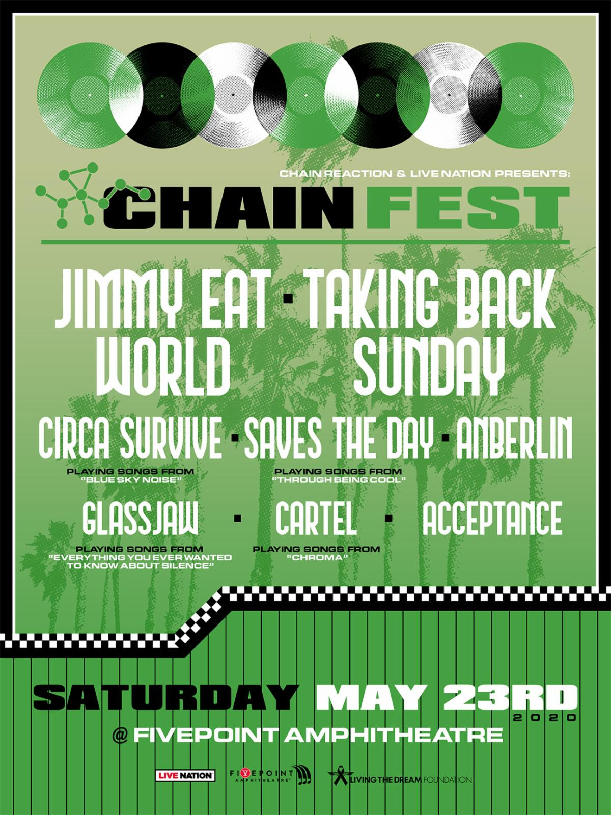 Returning again for another round, Chain Fest 2020 will host some of the greats in Punk, post-Hardcore, Alternative Rock and more at Chain Reaction this May! Jimmy Eat World, Taking Back Sunday, Circa Survive, Saves The Day, Anberlin, Glassjaw, Cartel, and Acceptance head the bill over FivePoint Amphitheatre on May 23rd, 2020. Tickets, including a limited number of VIP packages, are available now at the link below.