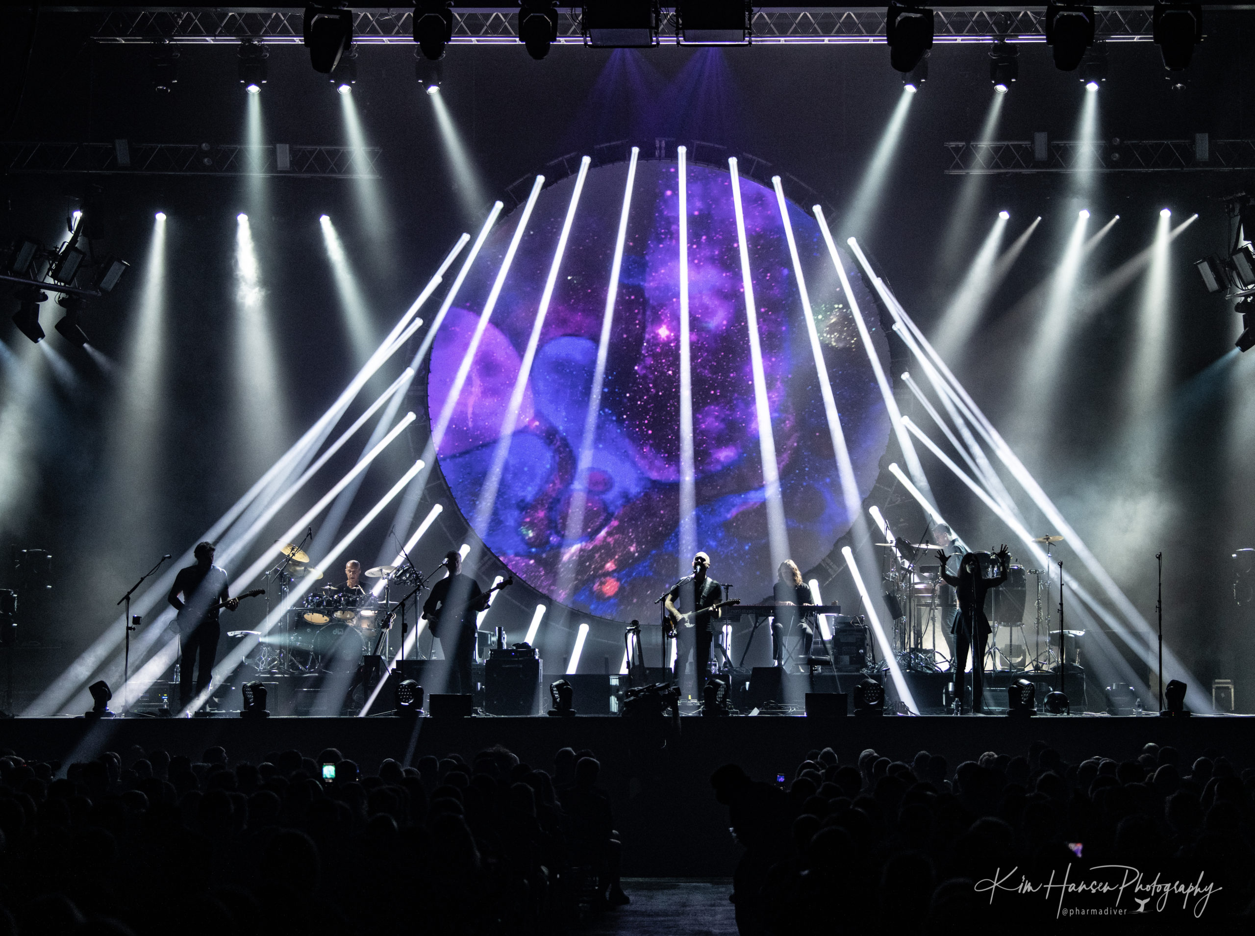 Now that everyone has settled in and had their preview, they launched into ‘Learning To Fly’ to the clear delight of the crowd. As the song progresses and the lights do their dance, the screen is filled with images and it becomes evident that Brit Floyd is very faithfully reproducing the extraordinary experience of a Pink Floyd Concert. It’s a spectacle where the lights, pictures and music combine to create a whole larger than the sum of the parts. The performers on stage are there to add a soundtrack to a visual explosion and not as the main focus.