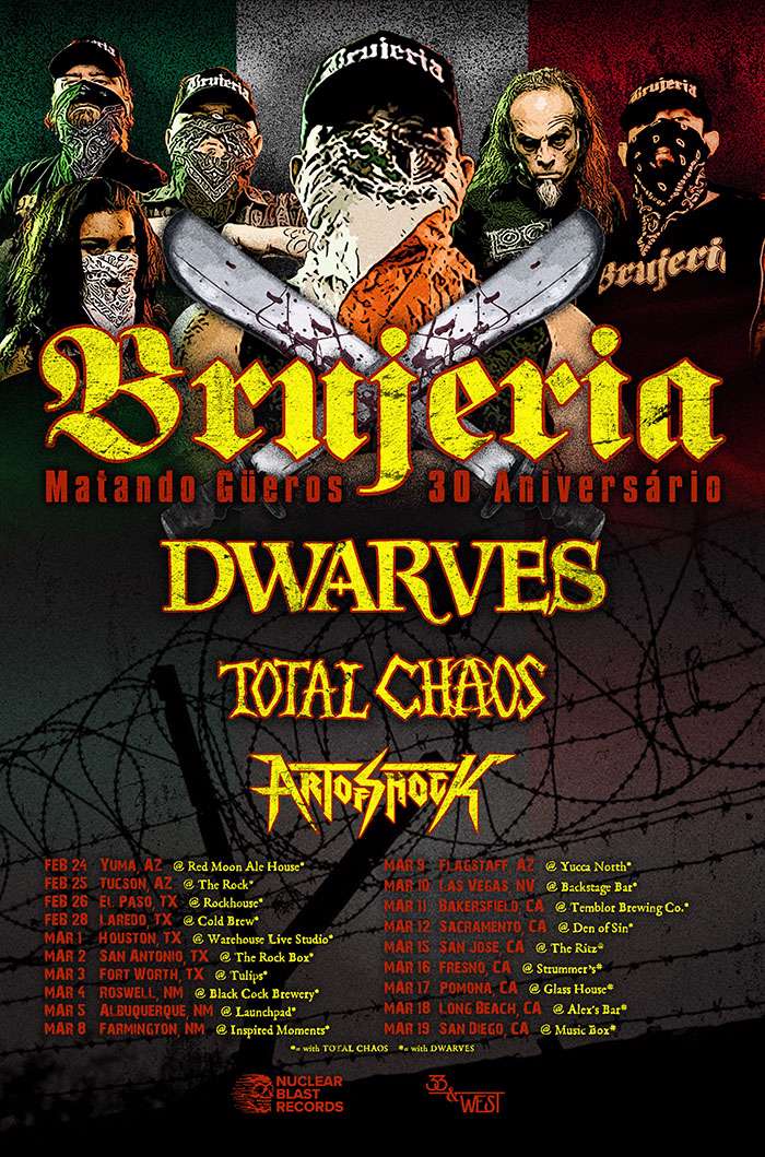 As I show up to Strummers, where Brujeria’s Matando Güeros 30th Anniversary Tour is playing tonight in Fresno, California, a fan ran up to the door and asked the guard if the show will still be happing in an hour. Walking into Strummers saddens me to not see a big crowd, but people spread out and some up close to the stage as Art of Shock is performing.