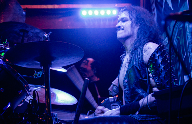 At last, the local gore band Cartilage, hosting their record release show for Tales From The Entrails: A Necrology, covered in blood and studs on their leather-looking outfit as a corpse head stands behind to mark the bands’ territory onstage while new song “Tales from the Entrails” is played in the background. Don’t let their stage faces scare you away, go meet them after the show at the merch table. They happen to be a nice band. They start with their new song “Globs of Glimmering Gore” as fans are eager and excited. With the stage blue lit, making vocalist Mark and guitarist/backup vocalist