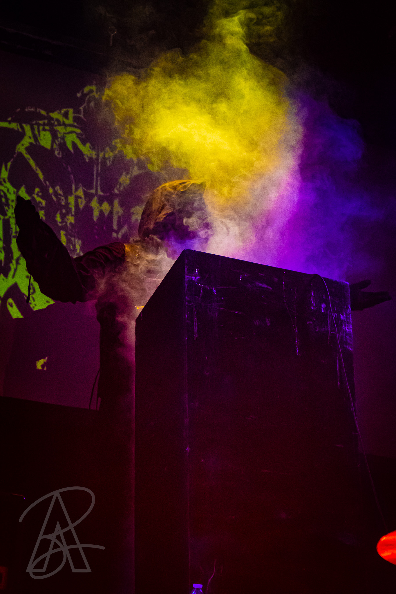 The show continued with Panzerfaust, another Canadian band from Mississauga, Ontario. I was first caught by the composition of the stage. Front and center, drummer, Alexander Kartashov, took a prominent position on the stage with the guitarist, Brock Van Dijk, and bassist, Thomas Gervais on either side of him and behind it all, towering above the musical madness, was a pulpit behind which vocalist, Goliath, would deliver their dark lyrics from a mist of fog and lights shrouded in a mysterious cloak. Right off the bat, Panzerfaust delivered the showmanship and energy and I was instantly engaged. Kartashov and Van Dijk, absolutely killed with their perfectly synchronized interplay, delivering a deep, booming, doomy rhythm highlighted by mastery use of cymbals. They built a perfect tension for the dark, nihilistic mood created by the commanding vocals floating over them. Their borderline tribalistic rhythm pulled me along the journey of the song and the multi-faceted guitar lit the path. Not to spoil the ending, but Panzerfaust was musically my favorite part of the evening.