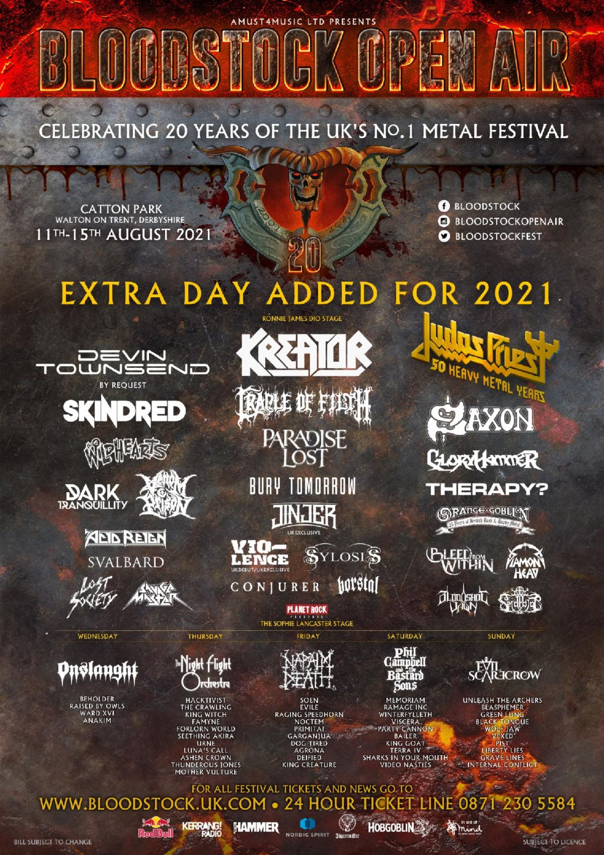 BLOODSTOCK’s 2021 main stage headliners are Devin Townsend (Friday), Kreator (Saturday), And Judas Priest (Sunday). The festival will also feature sets from Skindred, Paradise Lost, Bury Tomorrow, Diamond Head, Therapy?, Jinjer, Vio-lence, Saxon, The Wildhearts, Gloryhammer, Dark Tranquillity, Bleed From Within, Phil Campbell & The Bastard Sons, Memoriam, Ramage Inc., Green Lung, Conjurer, Orange Goblin, The Night Flight Orchestra, Raging Speedhorn, Unleash The Archers, Sylosis, Winterfylleth, Hacktivist, The Crawling, Raised By Owls, Acid Reign, Svalbard, Soen, Blasphemer, Pist, Sharks In Your Mouth, Seidrblot, Noctem, Mother Vulture, Bloodshot Dawn, Evile And Many More.