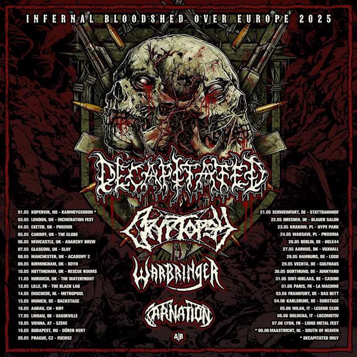 Death metal titans, Decapitated are kicking off their Infernal Bloodshed Over Europe Tour from the first of May. Support on the extensive 36 date run comes from heavyweights Cryptopsy, Warbringer, and Carnation. Find the live listings below.