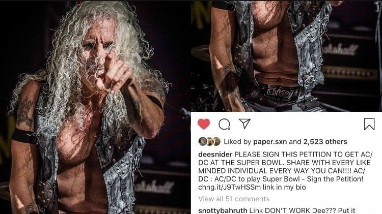 As we previously reported, Heavy Metal legend Dee Snider has helped launch a Change.org petition to get the NFL to hire classic rock legends and recently reunited AC/DC to perform at the SuperBowl Halftime show. Originally started by a fan, Gina Di Lecce, the petition grew from fan outcry and Dee’s criticism on social media following this year’s halftime show performance from Shakira and Jennifer Lopez. Heavy music is used constantly in sports, especially the NFL. Famously rock and metal bands such as Metallica, Foo Fighters, Avenged Sevenfold, and Guns N Roses (2020) have all performed on the NFL’s pre-game concert the day before. Anyone performing at the big game performs for free and must pre-record and lip-sync their performance, which is why some groups like Metallica have said definitely no to performing, while The Red Hot Chili Peppers infamously made fun of themselves lip-synching in 2014, with Flea being the most notorious culprit. They also were a guest of Bruno Mars and not a headliner themselves that night. The last real rock act to perform at the SuperBowl Halftime Show was The Who in 2010. in 2009. Anyway, sign the petition and let’s unite for rock and metal at The SuperBowl!