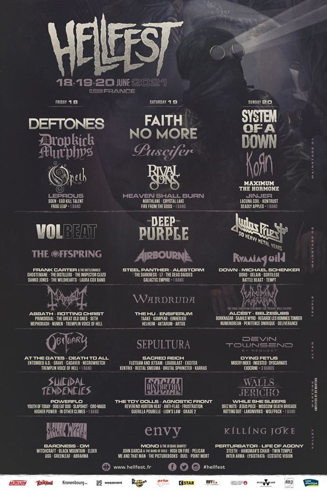 Hellfest Open Air recently completed its first-ever online streaming festival. Hopefully, the real thing is coming back next summer! The venerable metal and rock fest announced their lineup for 2021, with most of the bands slated to have played in 2020, but canceled due to COVID-19. Deftones, Faith No More, System of A Down, Judas Priest, Puscifer, Korn, Volbeat, Opeth, Dropkick Murphys, Northlane, Deep Purple, Wardruna, Rival Sons, Devin Townsend, Suicidal Tendencies, and many more will perform. Ten more bands will be added soon. Thirteen bands slated to play in 2020, but cannot attend 2021 include Incubus, Mastodon, Infectious Groove, Thy Art Is Murder, Alter Bridge, Baby Metal, Joyous Wolf, Unleashed, Meshuggah, The Black Dahlia Murder, Periphery, Body Count and August Burns Red.