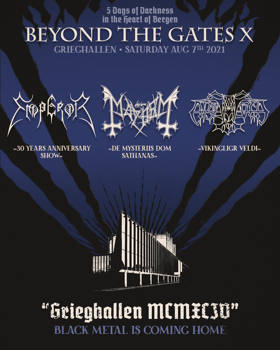 Three of the most legendary names in Black Metal will unite for an unforgettable event at next summer’s Beyond The Gates Festival in Norway! Emperor, Mayhem and Enslaved will perform at Grieghallen MCMXCIV as part of the fest with full-album performances of their classic works; Mayhem’s De Mysteriis Dom Sathanas, Emperor’s In the Nightside Eclipse, and Enslaved’s Vikingligr Veldi. All three monumental albums were recorded in the legendary Grieghallen Studios in Bergen. Tickets can be purchased at the link below and the full festival lineup, headlined by a reunited Mercyful Fate is here as well!