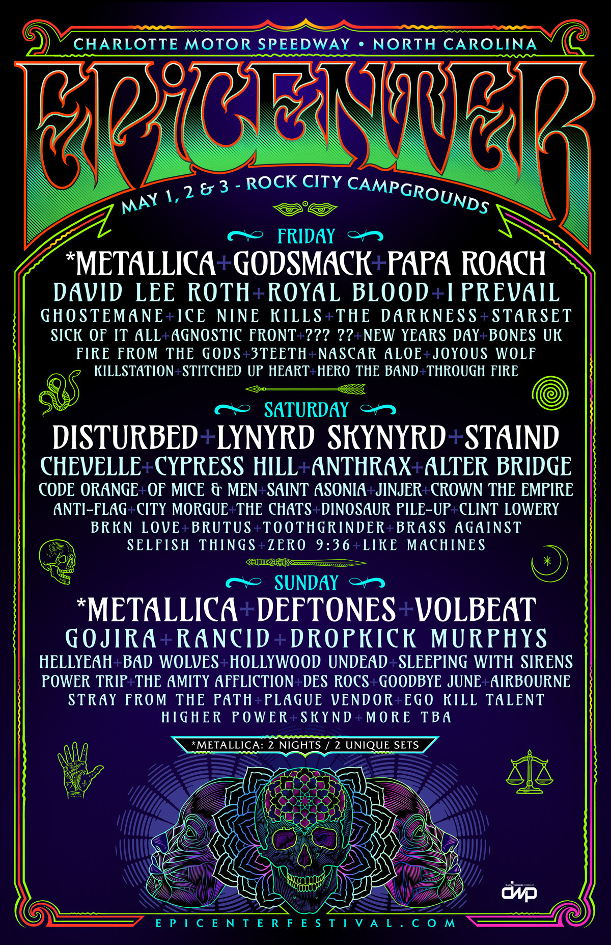 Finally! After the announcement of Metallica performing at all the Danny Wimmer Presents Fests in 2020, now the full lineup of Epicenter is here, and it’s stacked! Among the bands booked are Disturbed, Godsmack, Lynyrd Skynyrd, Deftones, Papa Roach, Papa Roach, Staind, David Lee Roth, Chevelle, Gojira, Royal Blood, Cypress Hill, Rancid, I Prevail, Anthrax, Dropkick Murphys, Alter Bridge and more. Check out the early bird discount tickets and the full poster below!