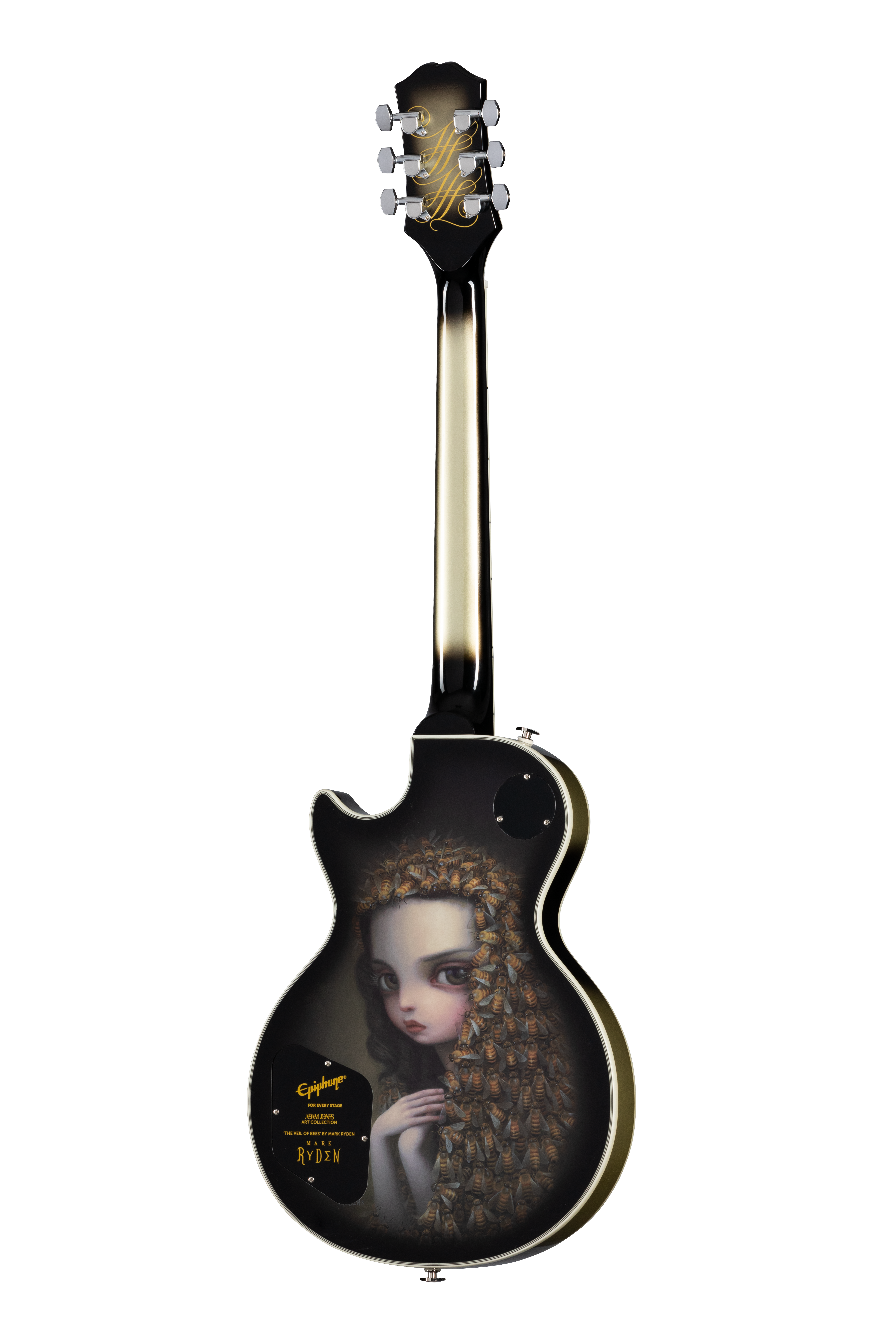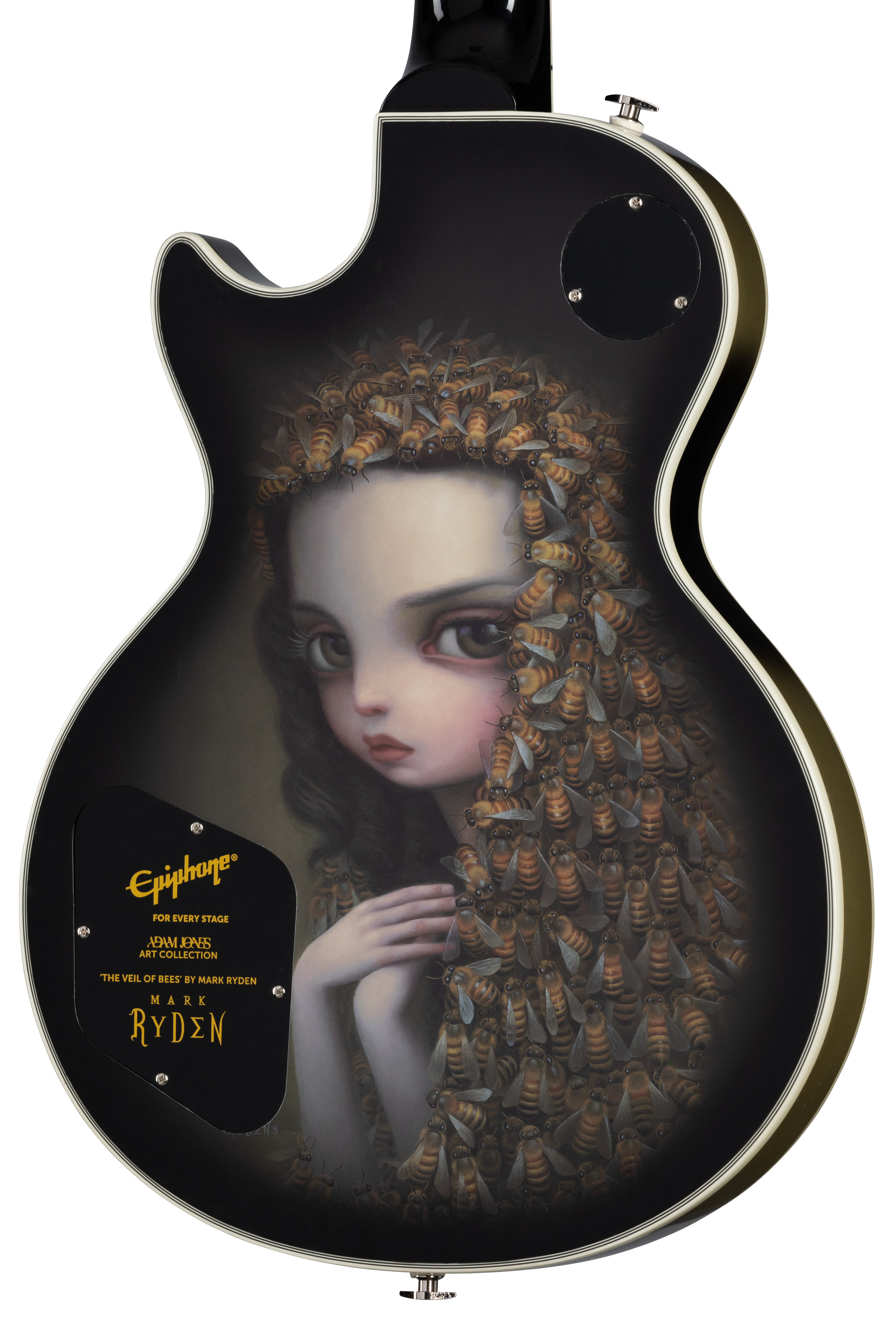 The first model to debut in the Adam Jones Les Paul Custom Art Collection is Mark Ryden’s “The Veil of Bees.” This guitar displays acclaimed artist Mark Ryden’s piece “The Veil of Bees” on the back of the guitar, in addition artwork on the rear headstock is designed by world-rehttps://www.epiphone.com/en-US/AdamJonesArtCollectionnowned artist Korin Faught.
