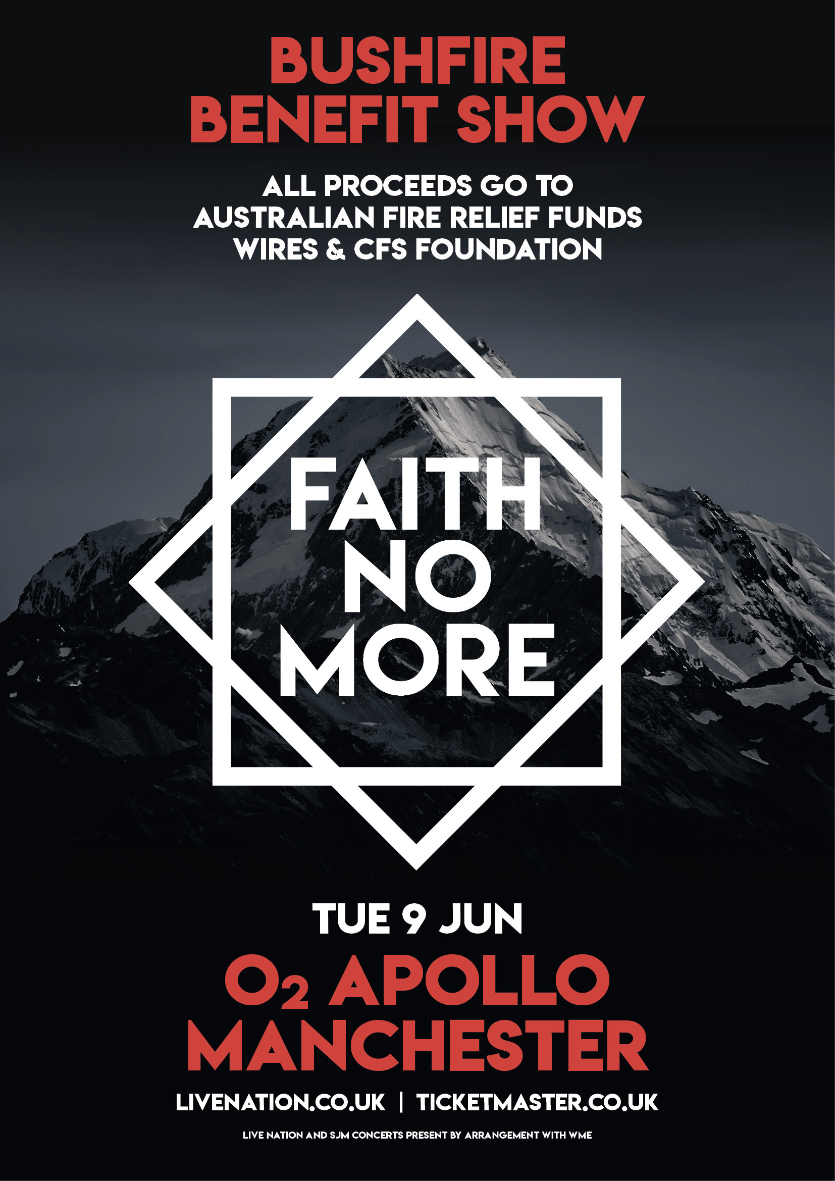 Faith No More has added a second Manchester, UK performance, June 9 at O2 Apollo, with both the band and Live Nation donating all proceeds from the outing to the Australian fire relief funds established by Wires (Wires.org.au) and the CFS Foundation (CFSfoundation.org.au). The show will fall in the reactivated legends summer European headline tour and festival appearances. Purchase tickets at the link below tomorrow, January 24 at 10 am GMT.