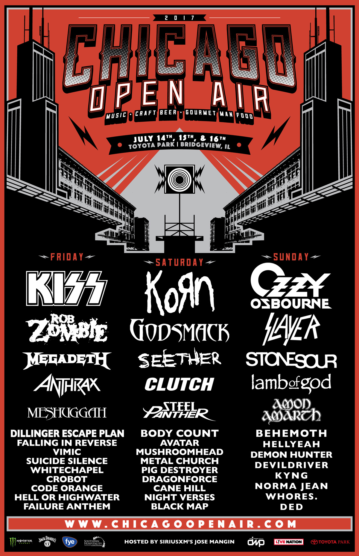 Chicago Open Air takes palce on July 14, 15 And 16 At Toyota Park In Bridgeview, IL and features headliners Kiss, Ozzy Osbourne And Korn. They will be joined by Rob Zombie, Slayer, Godsmack, Megadeth, Stone Sour, Seether, Anthrax, Lamb of God, Meshuggah, Amon Amarth and many more on the Main Stage and the BlackCraft Stage. SiriusXM’s Jose Mangin returns to host the weekend and introduce acts. General Admission and VIP tickets are on sale now at www.ChicagoOpenAir.com and at all Chicago-area Kuma’s Corner locations.