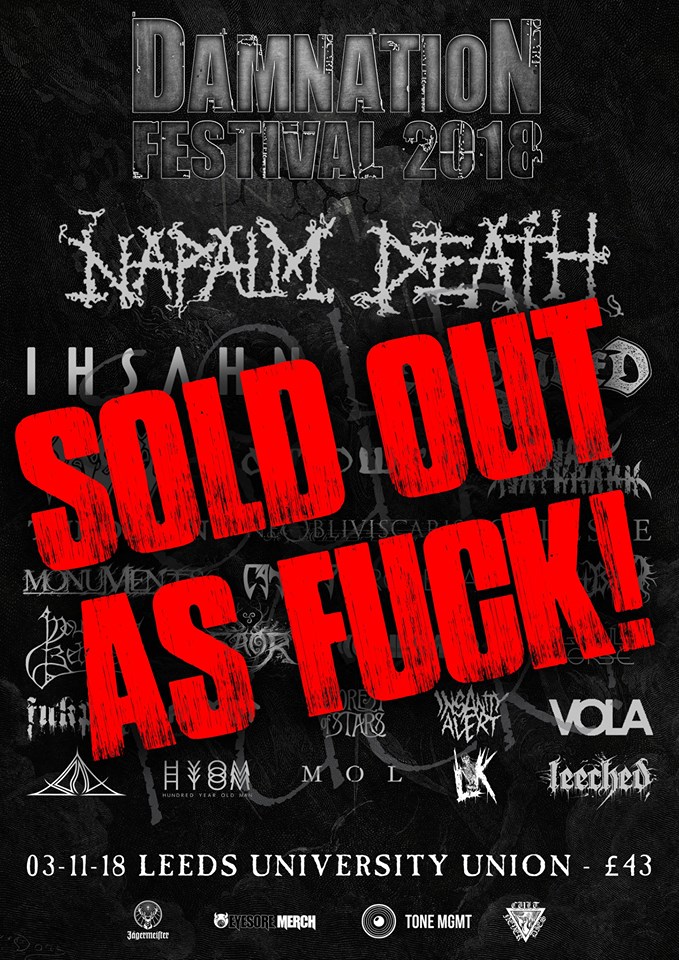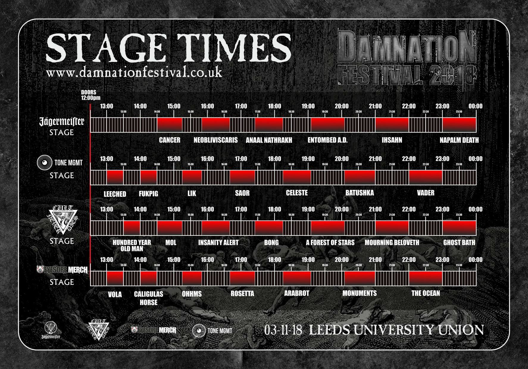 Damnation Festival, the long-running extreme underground one-dayer in the UK, takes place once again at Leeds University for the 13th edition. Headlined by Napalm Death, Ihsahn (exclusive UK appearance), Entombed A.D., Vader, Annal Nathrakh and also featuring Batoushka, The Ocean, Ne Obliviscaris, Celeste, Rosetta and more. Taking place on four stages with over 30 bands, this is a can’t miss show. If you don’t already have tickets, bad news, it is totally sold out! Most of the bands don’t clash too badly, save for Vader and The Ocean (tough call if you love both bands). Check out our stage by stage breakdown, clash minder, and other info below.