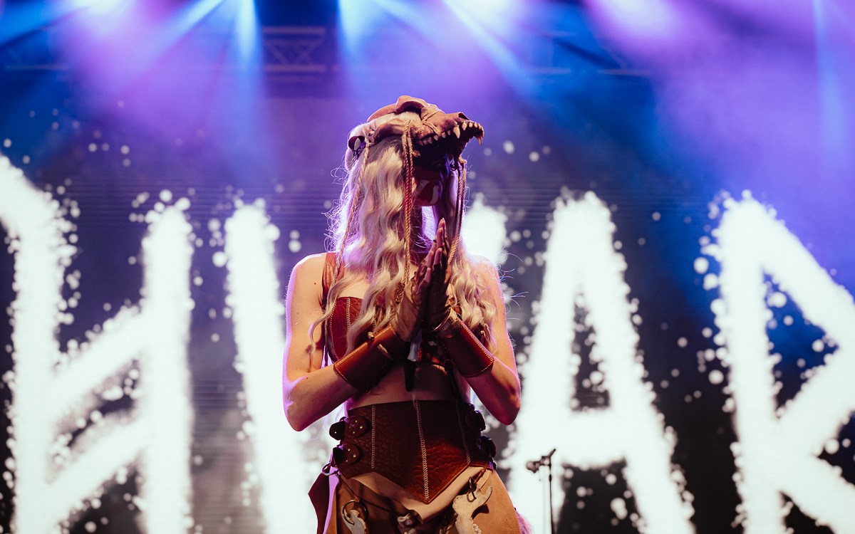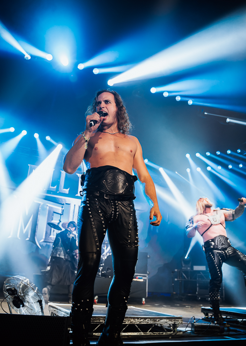After the gnomes have retreated to the safety of their woodland burrows, the Sophie stage is filled with the sound of True Metal and the smell of leather and baby oil. German/Italian act All For Metal worship at the altar of Manowar and don’t care who knows it. Drummer Leif Jensen and guitarist Ursula Zanichelli are the only two members of the band to actually remain on the stage while the rest of the band leap down and run alongside the barrier at every chance. Masked bassist Florian Toma spins around like a dog on speed chasing its tail while vocalists Tim “Tetzel” Schmidt and Antonio Calanna are happy showing off their muscles. Second guitarist Jasmin Pabst is leaving the band straight after the tour concludes, but is clearly making the most of her remaining time, giving songs like “Goddess of War,” “Raise Your Hammer” and “Born in Valhalla” some serious energy and just as many interesting facial expressions.