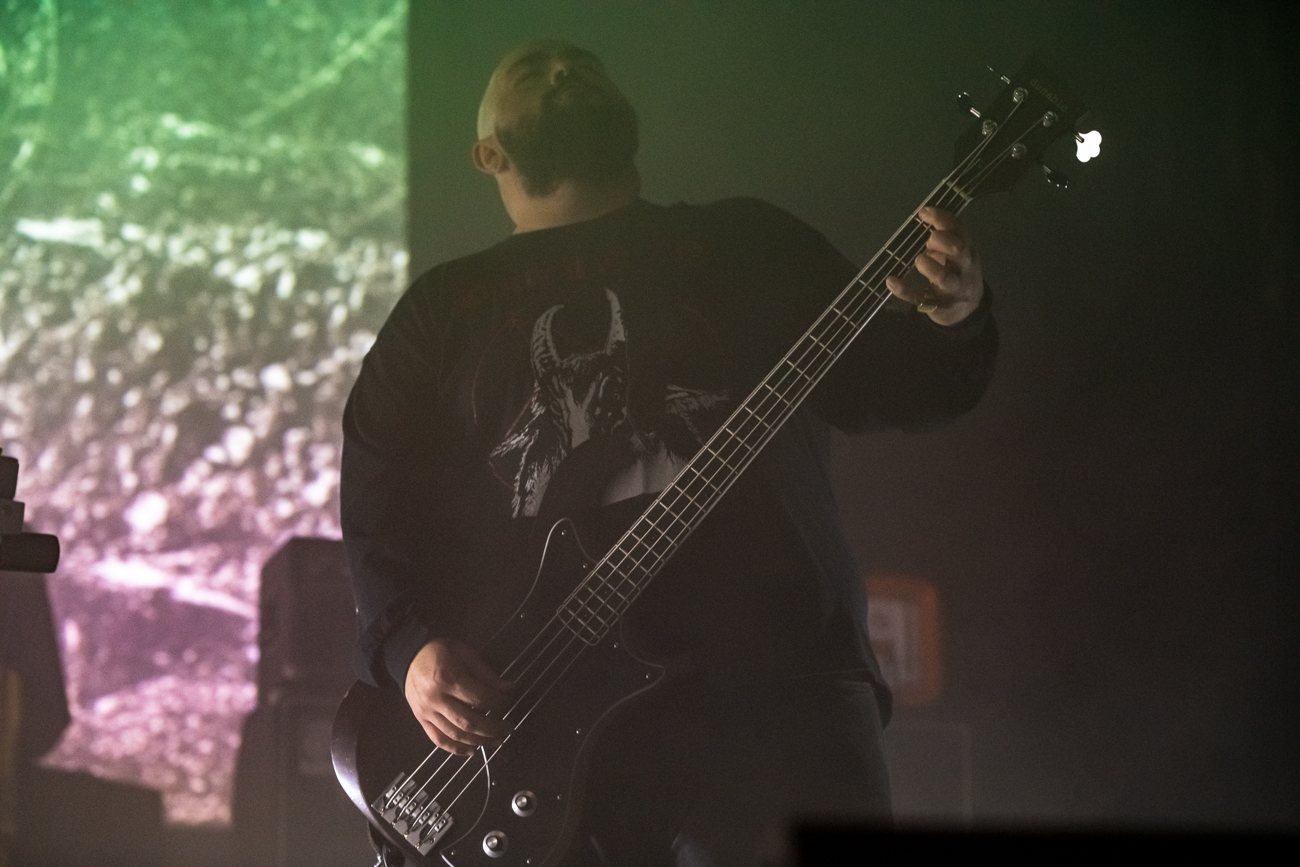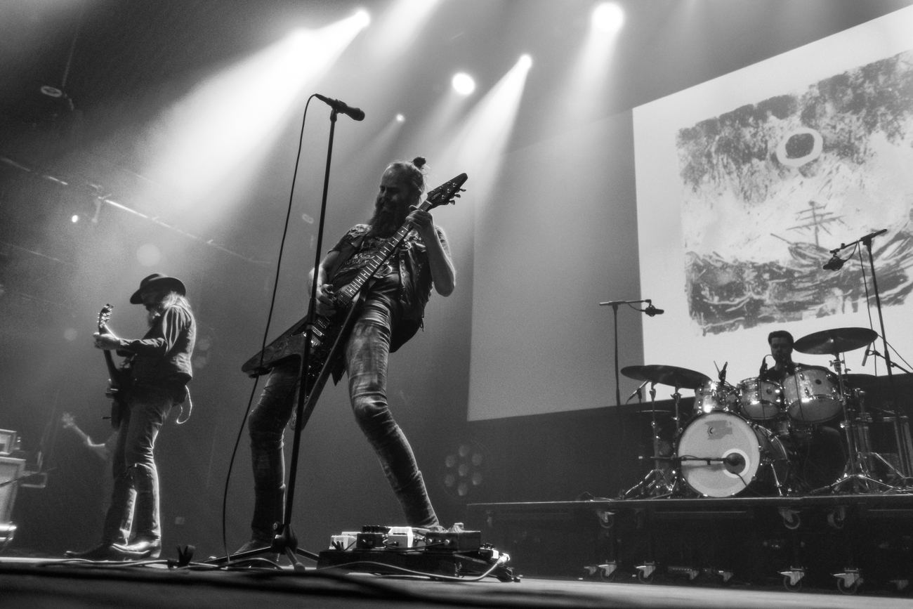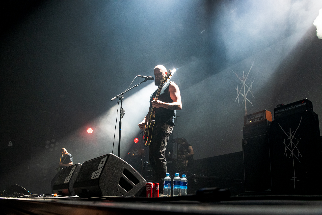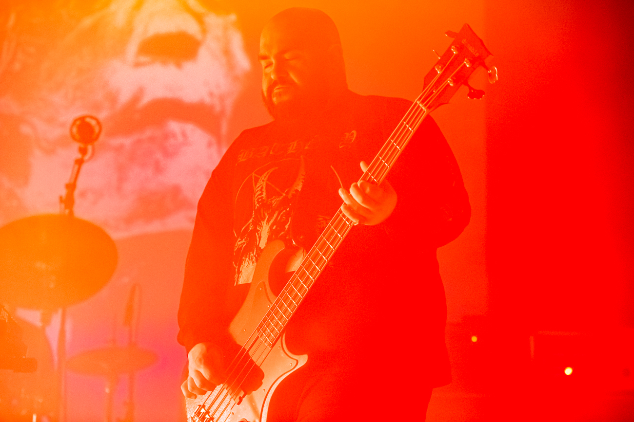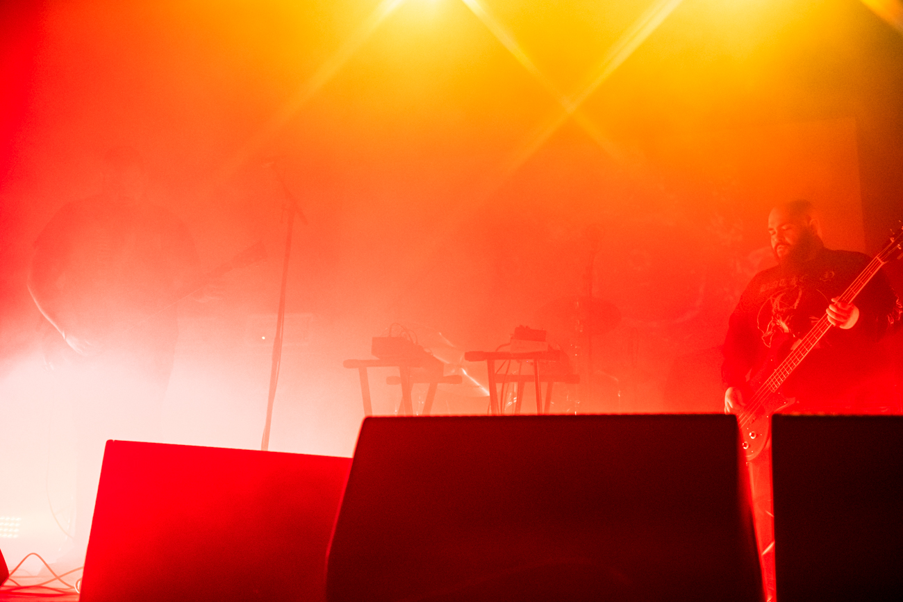 After this little party we make our way back to catch Sólstafir playing Svatir Sandar in full, the album that hearkened their breakthrough. This album contained the gorgeous “Fjara”, their first hit, which is still played regularly by the band. Other songs of the much heavier album however have slowly faded out of the setlists as the band took a more polished path in their musical explorations. So it is a treat to see the band return to these riffy, grittier works, accompanied by videos from Icelandic films to set the tone. Having seen Sólstafir perform when this album was still fresh, the growth of the band as a unit, performers and in their craft is evident, and a joy to behold. We shall assume that light tech is a little rusty after two years of no gigs, or just not used to the 013’s massive array of lights, but the sometimes odd lighting can’t spoil the experience for those who love the Icelandic band playing.