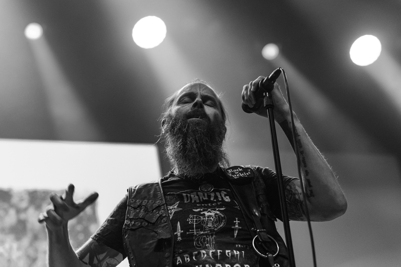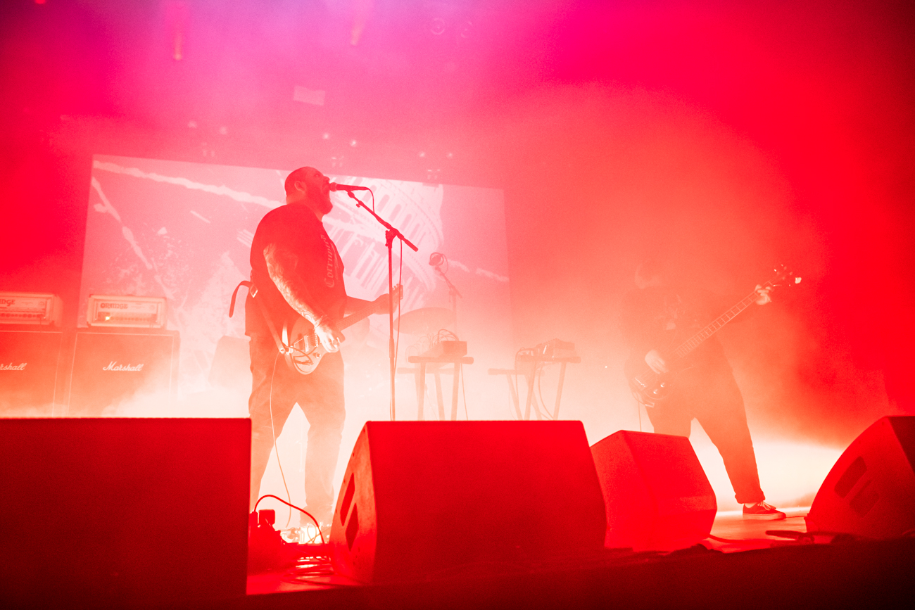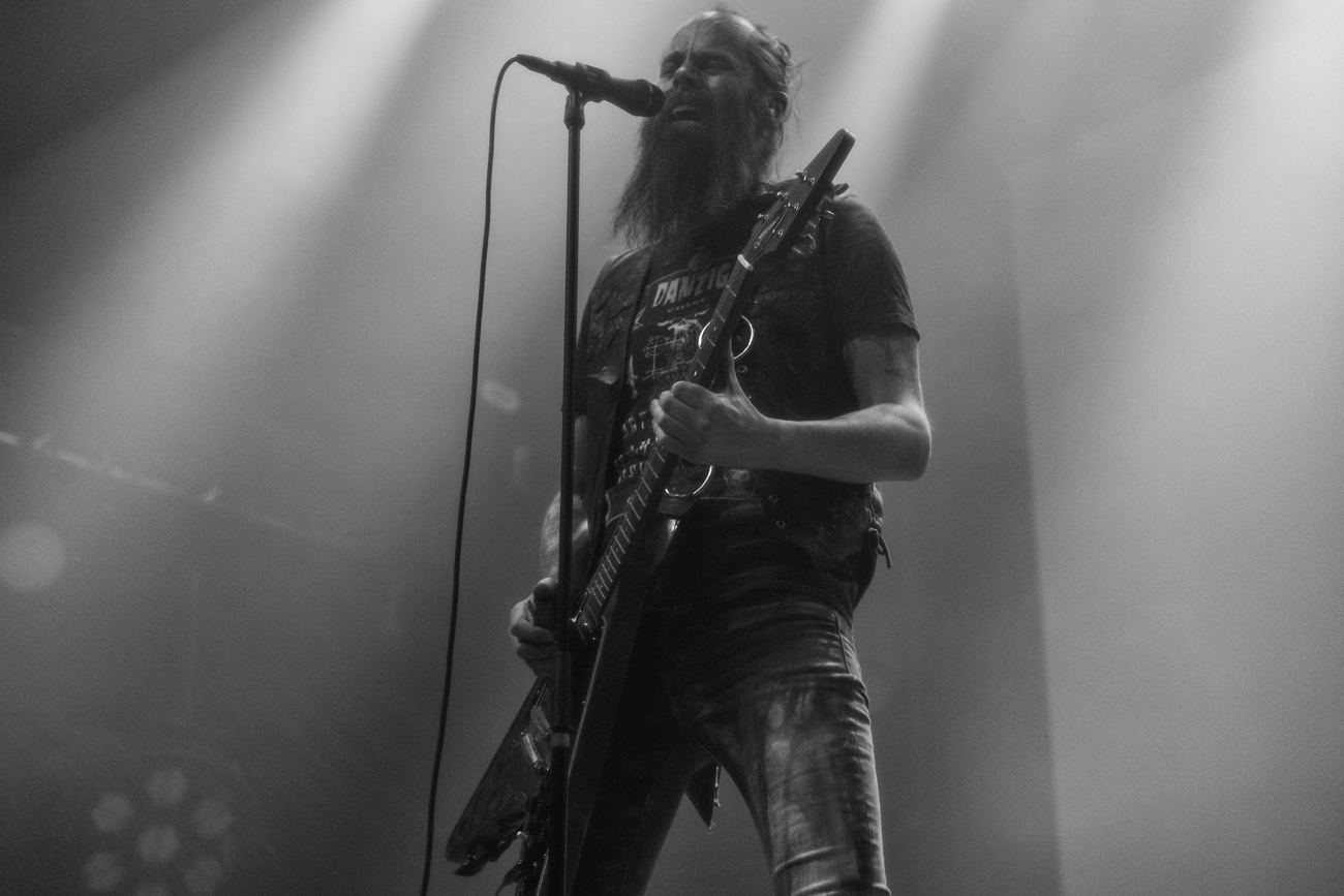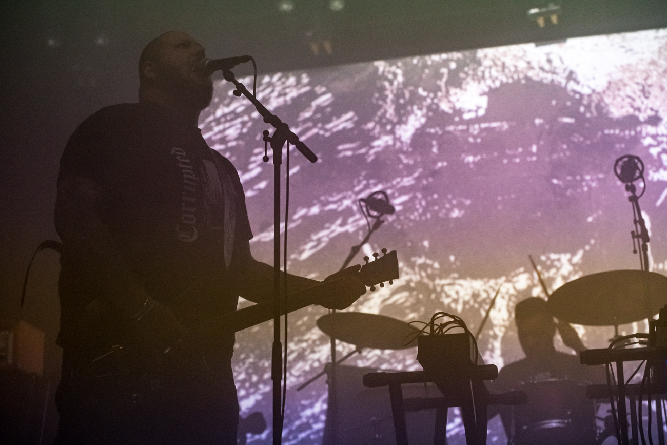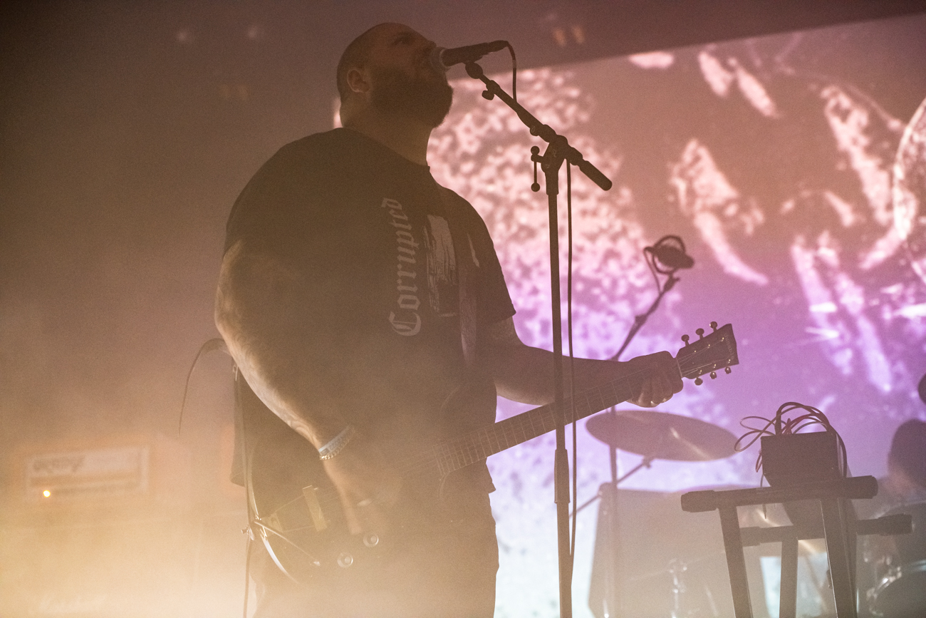 After this little party we make our way back to catch Sólstafir playing Svatir Sandar in full, the album that hearkened their breakthrough. This album contained the gorgeous “Fjara”, their first hit, which is still played regularly by the band. Other songs of the much heavier album however have slowly faded out of the setlists as the band took a more polished path in their musical explorations. So it is a treat to see the band return to these riffy, grittier works, accompanied by videos from Icelandic films to set the tone. Having seen Sólstafir perform when this album was still fresh, the growth of the band as a unit, performers and in their craft is evident, and a joy to behold. We shall assume that light tech is a little rusty after two years of no gigs, or just not used to the 013’s massive array of lights, but the sometimes odd lighting can’t spoil the experience for those who love the Icelandic band playing.
