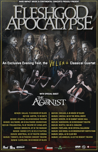 Symphonic Death Metal band Fleshgod Apocalypse has booked a full US tour for 2020, with direct support from The Agonist. Unique to this tour, Fleshgod will be joined by a classical string quartet to bring their album sound into the live setting even more than ever! The band released their new album Venelo this year via Nuclear Blast Records. Check out the dates below. The tour begins in Dallas, TX on March 16th and culminates in Los Angeles on April 6th. Ticket sales are listed below. You can see a video interview we did with the band earlier this year when Francesco alludes to touring with the string quartet.
