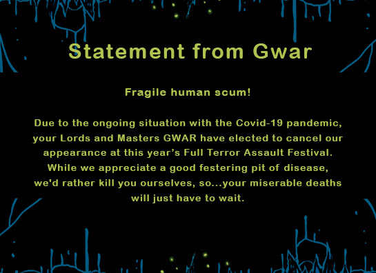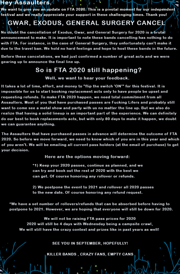 Full Terror Assault Festival, slated for September, is in trouble. The festival just lost it’s two headliners and one of its other frontline bands. The fifth annual festival is to take place this year, the first of its kind, “open air” European style metal festival. GWAR, Exodus, and General Surgery has all announced they will not perform at the festival since they are all canceling all of their 2020 shows. They were to have announced more bands for the fest this week and they still might as the location for the fest reopened recently. The festival has launched a private survey for fans to gauge if the fest should carry on or not. Also slated to appear are M.O.D., War Curse, ground, Shock Narcotic, Extinction A.D., Axeslasher, Duskwalker, Escuelagrind, Pillory, and many more at Hogrock Campground, at Cave In Rock, Illinois September 9 -11th. FOundr Joey Bee will also join the Most Epic Adventures show with Robb Zip on Thursday for a live Q & A with an update at 6:30 CST.