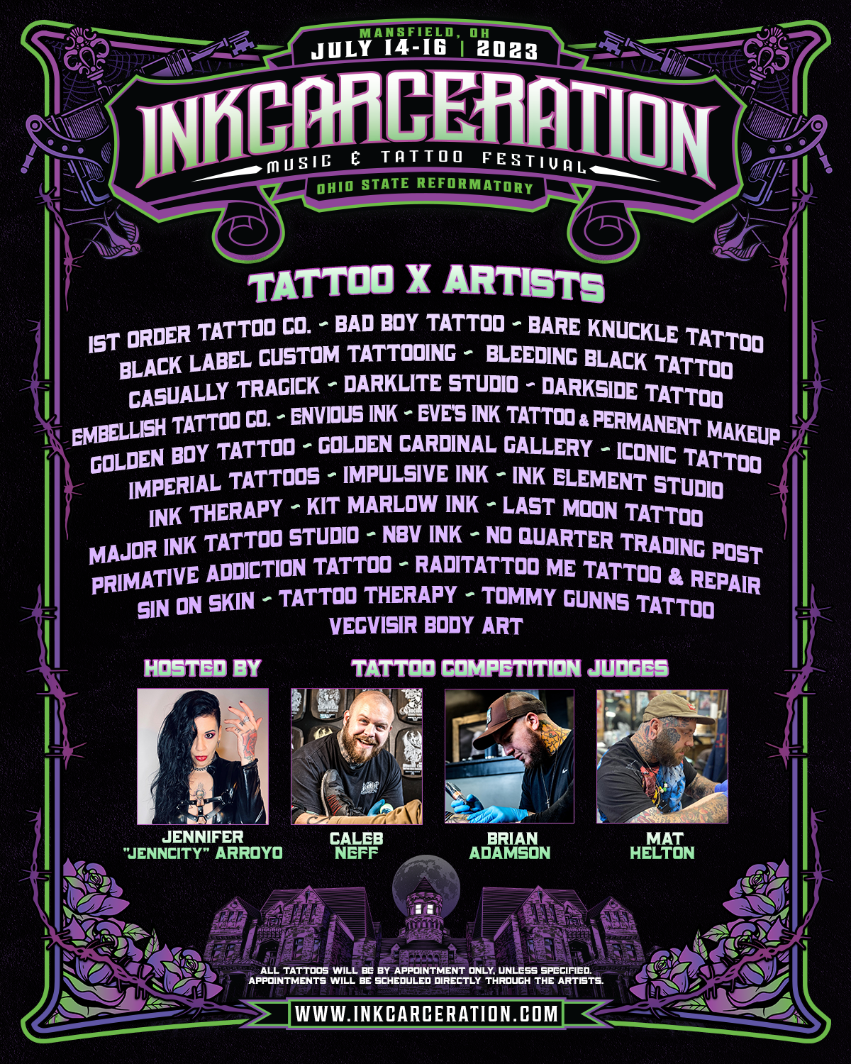 Danny Wimmer Presents Inkcarceration Festival 2023 has announced its full lineup of bands and tattoo artists. Headliners include Limp Bizkit, Slipknot, Pantera, Volbeat, Lamb of God, Bush, Megadeth, and Flyleaf with Lacey Sturm, along with 10 Years, In This Moment, Underoath, Hatebreed, P.O.D, The Ghost Inside, Wage War, Coal Chamber, and many more. The festival will be on July 14, 15, and 16 at the infamous Ohio State Reformatory (the site of the film The Shawshank Redemption) in Mansfield, Ohio. INK festival is a truly unique Rock & Tattoo Festival featuring 40+ bands on 3 stages, tattoo artists from around country, tours of the prison, gourmet food, camping, and more. Tickets are on sale now at the link below