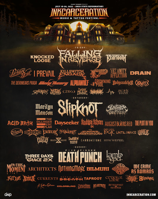 The music set times and additional onsite experiences have been announced for the 7th Inkcarceration Music & Tattoo Festival, featuring 66 massive rock and metal bands across 3 stages, along with 100+ tattoo artists and haunted attractions, July 18-20 at the historic Ohio State Reformatory in Mansfield, Ohio. Festival producer Danny Wimmer Presents has also launched the 2025 Inkcarceration mobile app so fans can create personalized itineraries for America’s Rock, Metal and Tattoo Festival and reserve their tours of the infamous Blood Prison.