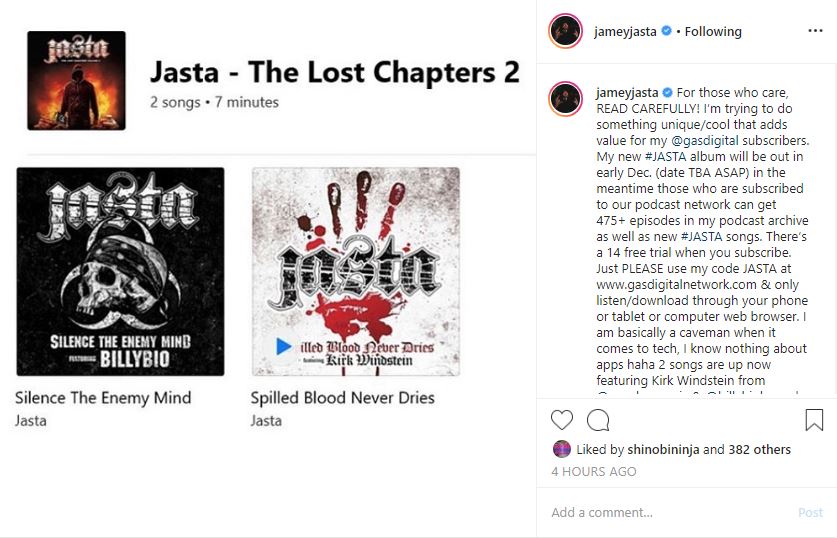 Jamey Jasta of Hatebreed is releasing his long in the works solo project album Jasta: The Lost Chapters Volume 2 this fall. Jasta announced today that he is offering subscribers to his podcast, The Jasta Show, via Gas Digital a special offer to get early access to the two new singles and the album before the public can buy or stream it. The two singles are ‘Spilled Blood Never Dies’ ft Kirk Windstein of Crowbar, and ‘Silence the Enemy Mind’ with Billybio’s Billy Graziadei. The album features guest appearances from Max Cavalera, George “Corpsegrinder” Fisher, Jesse Leach, Windstein, Howard Jones, Matthew K Heafy, Zoli Teglas, Billy Bio, Phil Rind, Tommy Victor, Joey Concepcion and Frankie Palmieri, as well as his backing band consisting of Charley and Nicky Bellmore (Dee Snider). Jasta will likely not tour behind this album right away since his focus for 2020 will be recording the new Hatebreed album. Jasta’s podcast airs two episodes weekly (Tuesday and Friday) in an interview format, often featuring hour-long, in-depth chats with legends. He is nearing 500 episodes, with the current edition #489, with Amigo The Devil, just aired.