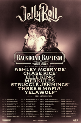 After dominating Billboard’s Emerging Artist Chart for a record-breaking 25 consecutive weeks – ultimately breaking the record of most weeks spent at No. 1 – with his single, “Son Of A Sinner,” multi-genre hitmaker Jelly Roll today announced his Backroad Baptism Tour. Produced by Live Nation, the 44-city arena tour kicks off on Friday, July 28th at Bank Plus Amphitheater in Southaven making stops across the U.S. in Milwaukee, Kansas City, Cincinnati, and more before wrapping up in Tampa at MidFlorida Credit Union Amphitheater on Saturday, October 14th. Tour openers include Ashley McBryde, Caitlynne Curtis, Chase Rice, Elle King, Merkules, Struggle Jennings, Three 6 Mafia, Yelawolf and Josh Adam Meyers. As previously announced, Jelly Roll will also open on several dates as direct support for Eric Church.