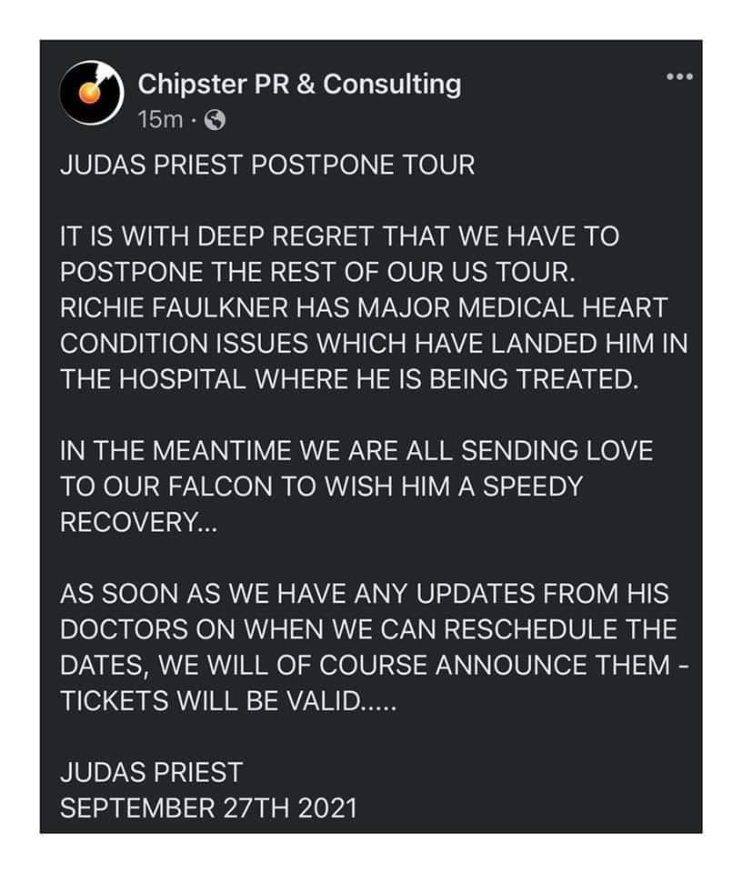 Devastating news as Judas Priest shredder Richie Faulkner has a major medical condition (heart) that has landed him in the hospital for treatment. Thus the Judas Priest tour is postponed until a later date. News was proken by the Judas Priest PR team. The Priest were finally celebrating their 50th anniversary this year with the The 50 Heavy Metal Years Tour, with Sabaton as openers.Get well soon Richie!