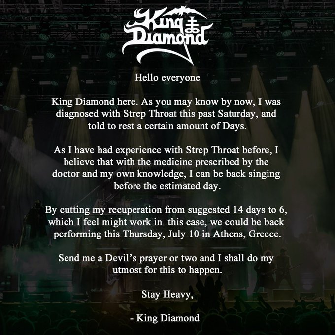 “As you may know by now, I was diagnosed with Strep Throat this past Saturday, and told to rest a certain amount of days. As I have had experience with strep throat before, I believe that with the medicine prescribed by the doctor and my own knowledge, I can be back singing before the estimated day. By cutting my recuperation from suggested 14 days to 6, which I feel might work in this case, we could be back performing this Thursday, July 10 in Athens, Greece. Send me a Devil’s prayer or two and I shall do my utmost for this to happen.”