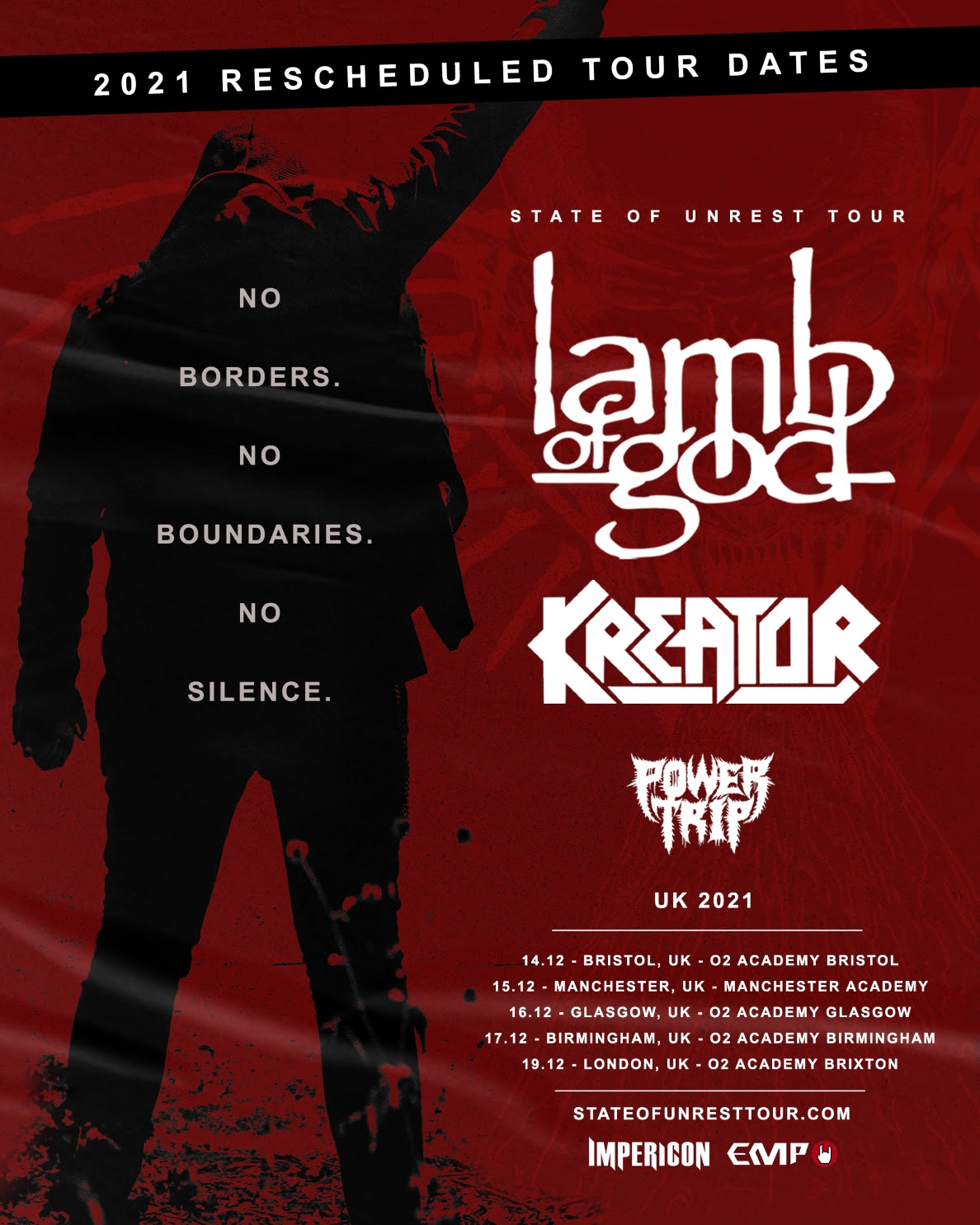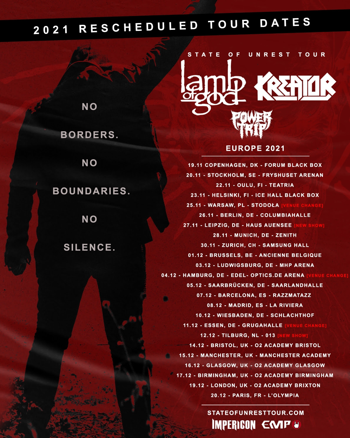 Tickets bought for the original shows (including those with venue changes) remain valid for the new dates. Tickets for all the rescheduled shows and the new show in Leipzig go on sale immediately. Tickets for the new show in Tilburg go on sale on Monday 3rd August at 11am CET (10am BST). To buy tickets for the UK dates, please contact box offices or buy online via www.stateofunresttour.com and https://www.livenation.co.uk/artist/lamb-of-god-tickets.