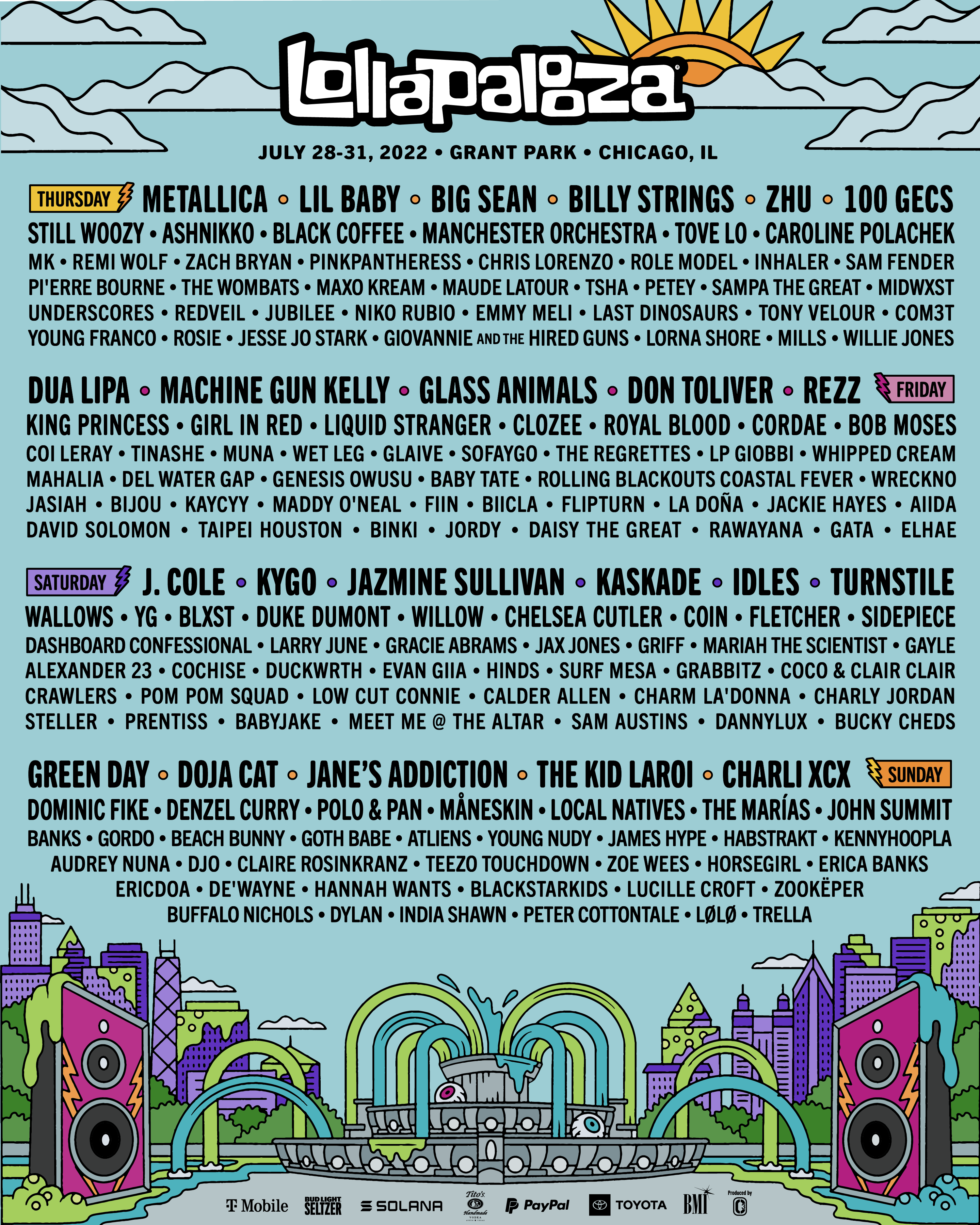 Lollapalooza has announced its daily lineups for the 2022 festival in Chicago this July! Headliners include Metallica, Dua Lipa, J. Cole, Green Day, Doja Cat, Machine Gun Kelly, Lil Baby, Kygo, along with Jane’s Addiction, Glass Animals, Billy Strings, Big Sean, The Kid Laroi, Jazmine Sullivan, Don Toliver, Charli XCX, Idles, Turnstile, Kaskade, Rezz, and many more. More than 170 bands, nine stages, and four full days of music, July 28-31 in Chicago’s crown jewel, Grant Park. 4-Day Tickets are onsale now at the link below.