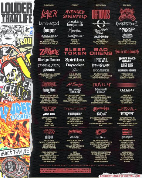“Louder Than Life has always been about showcasing the future of rock and heavy music while honoring the legends who paved the way. Bands like Bring Me The Horizon, Sleep Token, Bad Omens, $uicideboy$, Motionless In White, Spiritbox, I Prevail, Slaughter To Prevail, Lorna Shore, Wage War, Dayseeker, and Knocked Loose aren’t just performing—they’re defining the next generation of headliners,” says Danny Wimmer of Danny Wimmer Presents. “At the same time, pioneers like Slayer, Deftones, A Perfect Circle, and Avenged Sevenfold have set the standard, proving that this music is always evolving. This is where the past, present, and future of heavy music collide.”