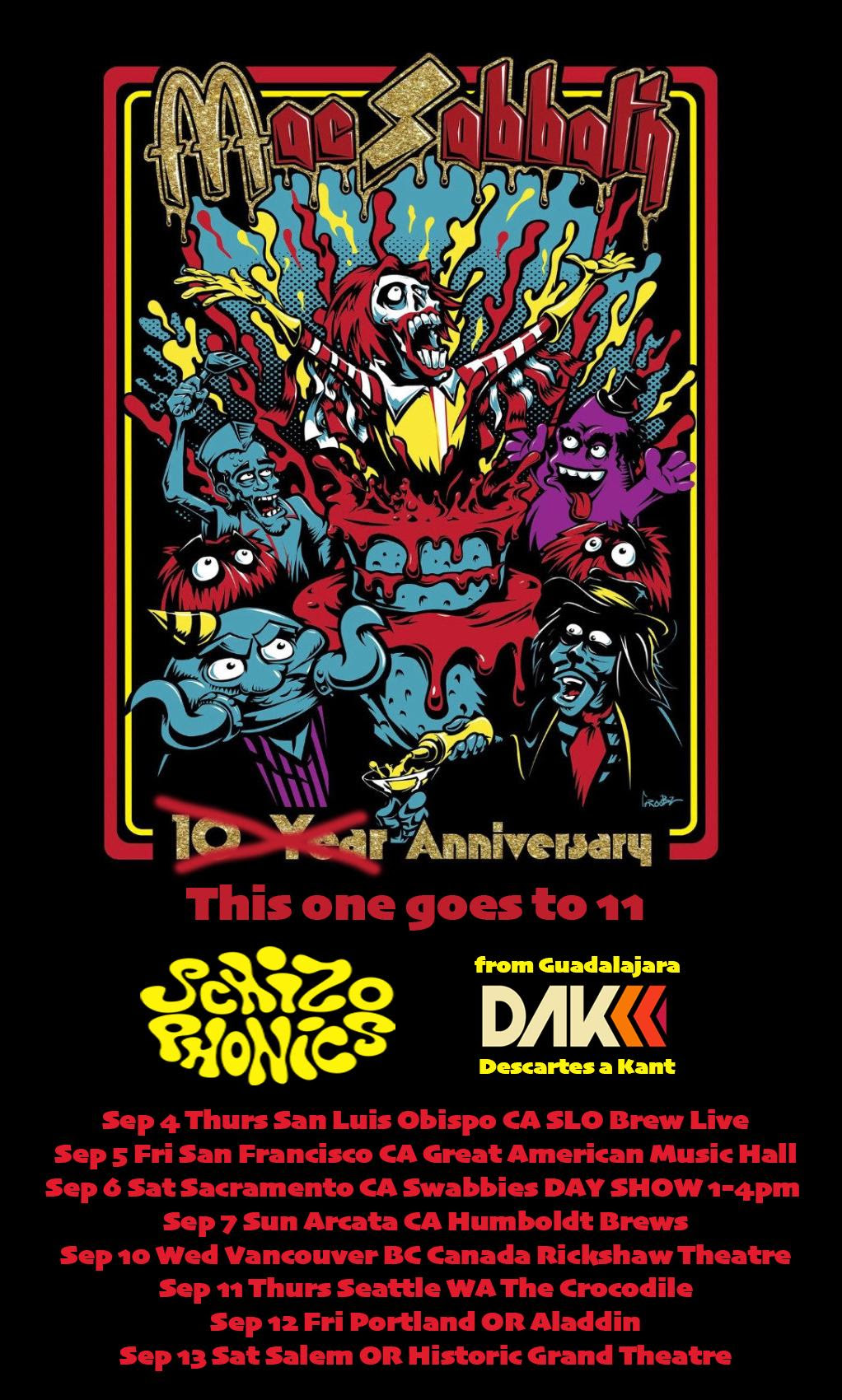 “We at the Mac Sabbath camp are overwhelmed with emotion. Ever since July 22 All things have been Black and nothing Mac. “The wheels of confusion” are turning and it’s time to get back on the road. Ozzy said he did not want a mope-fest So in the true spirit, it’s time to celebrate with heavy riffs and hilarious hijinks So Mac is back spreading some bittersweet smiles across the west coast this Sept. With the Schizophonics being proclaimed as the highest energy rock band touring to date and Guadalajara’s Descartes A Kant providing a sexy space rock show of Sci-fi proportions, this 3 ring circus is a tribute in its own right. God bless Ozzy Osbourne”