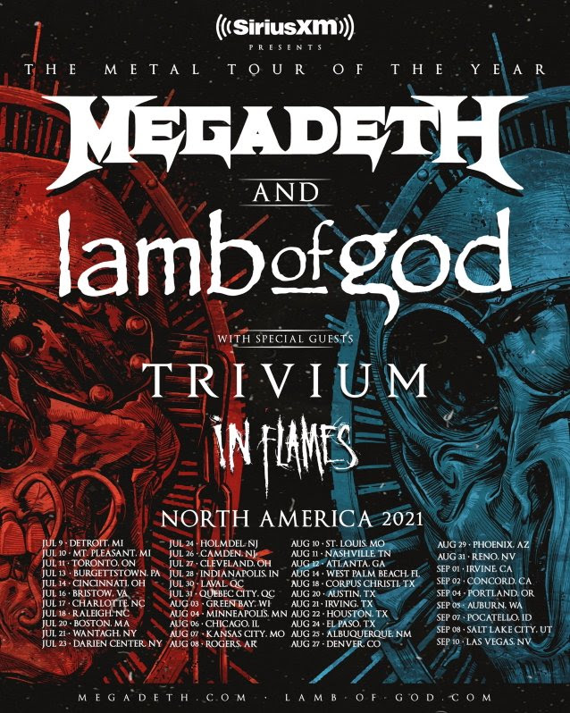 Earlier today, Megadeth, Lamb of God, Trivium, and In Flames released the following joint statement: “We are excited to share the new 2021 dates for ‘The Metal Tour Of The Year’. All tickets will be honored for the new rescheduled dates. If you are a ticket holder and cannot make the new show, you will receive an email directly allowing you to request a refund. For more details, please visit livenation.com/refund.