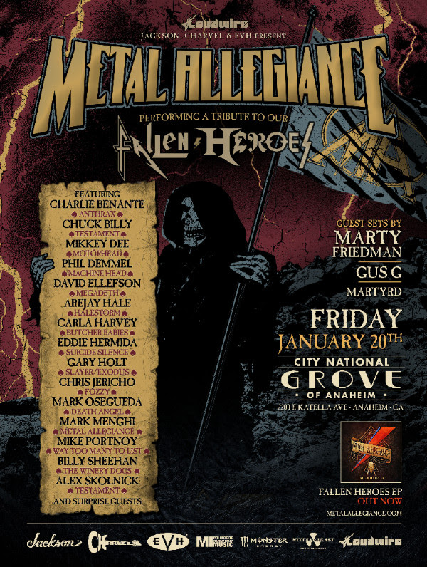 Metal Allegiance, the all-star band of metal legends led by Mark Menghi, will take over City National Grove of Anaheim during NAMM on January 20th for a monumental tribute to our fallen musical heroes. Hosted by Jackson, Charvel & EVH, with Loudwire, and Musician’s Institute and Monster Energy joining as co-sponsors of the event. Mikkey Dee (Motorhead), Eddie Hermida (Suicide Silence), Arejay Hale (Halestorm) and Carla Harvey (Butcher Babies) are now added to the line-up.