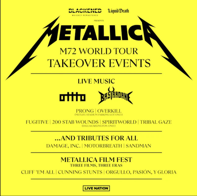 Metallica has announced “takeover” events during the 2023 North American leg of the band’s M72 world tour. As part of two-night stands in cities around the U.S. Canada between August and November, there will be film fests, pop-up stores, Ross Halfin book signings, All Within My Hands-sponsored opportunities to give back, as well as live music by Bastardane (the band featuring drummer Castor Hetfield, the son of Metallica frontman James Hetfield) and OTTTO (the three-piece band featuring Tye Trujillo, the son of Metallica bassist Robert Trujillo), along with tribute bands Damage Inc., Motorbreath And Sandman.