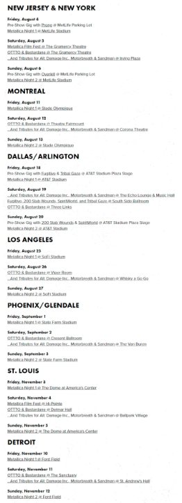 “On each Saturday between the two ‘No Repeat’ weekend shows, there will be film fests, pop-up stores, Ross Halfin book signings, AWMH-sponsored opportunities to give back, and so much more. And let’s not forget live music! The lineup making its way through North America with us includes some familiar faces: OTTTO and BASTARDANE, along with tribute bands DAMAGE INC., MOTORBREATH, and SANDMAN. Plus, a few more acts will join the fun in individual cities.