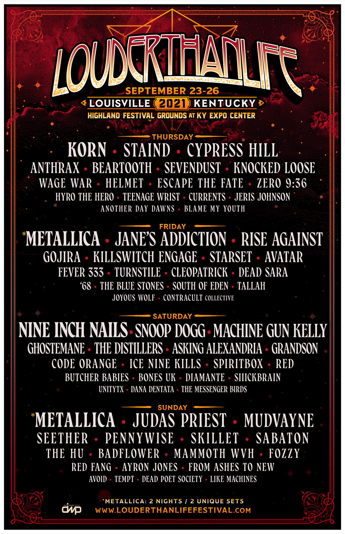 An incredible music lineup has been announced for the sixth Louder Than Life, September 23-26, 2021 at Highland Festival Grounds at KY Expo Center in Louisville, Kentucky. Metallica (two nights / two unique sets), Nine Inch Nails and KORN will headline the largest rock festival in America, which will also feature performances from Judas Priest, Snoop Dogg, Jane’s Addiction, Staind, Rise Against, Mudvayne, Cypress Hill, Machine Gun Kelly, Anthrax, Gojira, Ghostemane, Seether, Pennywise, Beartooth, The Distillers, Killswitch Engage and many more.