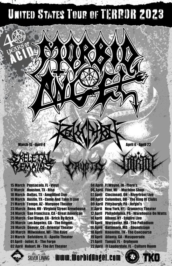 Legendary death metal icons Morbid Angel will celebrate their 40th anniversary this Spring with a month-long US headlining tour! The United States Tour Of Terror 2023 will commence on March 15th in Pensacola, Florida and run through April 22nd in Ft. Lauderdale, Florida. Support will be provided by Revocation and Crypta as well as Skeletal Remains from the March 15th through April 4th and Vitriol from April 6th through the tour’s conclusion.