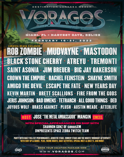 “I’m far beyond stoked to be hanging and partying with so many friends and family on VORAGOS, and getting to host it is even better,” comments Jose Mangin. “This destination cruise is going to be one for the record books for sure! A festival on the beach, and concerts on board, it’s so badass! I can’t wait to throw down hard with you and my Metal shipmates in Mudvayne, Mastodon, Atreyu, my AZ homies DED, Rob Zombie and so many others!”