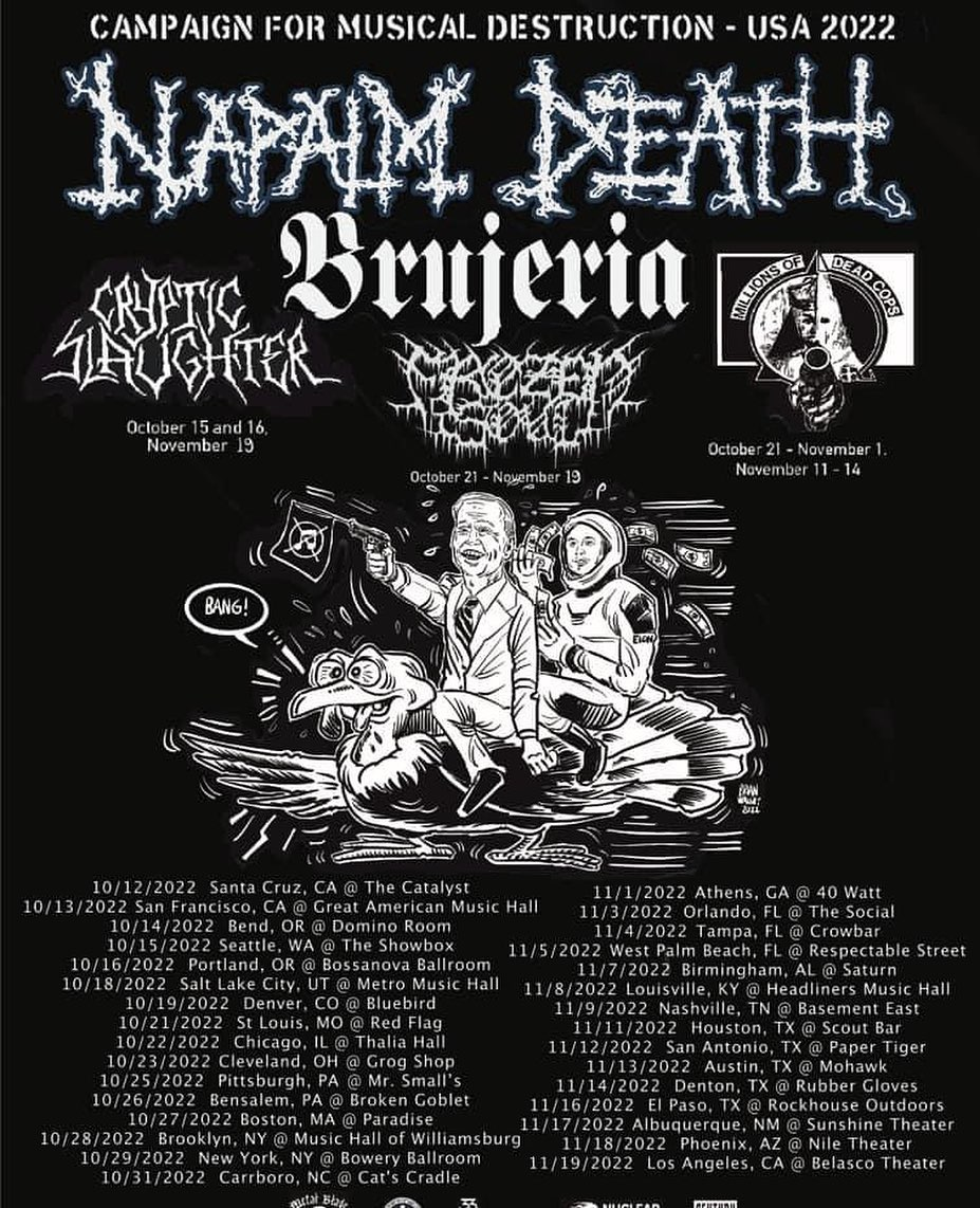 Grindcore legends Napalm Death have booked an extensive tour of “Campaign For Musical Destruction” U.S. tour this fall. Support on the trek will come from Brujeria, and on different dates direct support from Frozen Soul, Cryptic Slaughter and MDC on select dates.