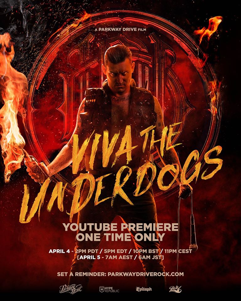 Parkway Drive will unveil their epic new Viva The Underdogs documentary via YouTube for free today! The soundtrack to Viva The Underdogs came out last week. Their epic new documentary – “which gives an incredibly honest and candid look at Parkway Drive’s 15-year underdog journey” – one time only – on April 4 from the following times: 2pm PT / 5pm ET / 10pm BST / 11pm CEST / Sunday, April 5 7am AEST / 6am JST. Watch at the link below!
